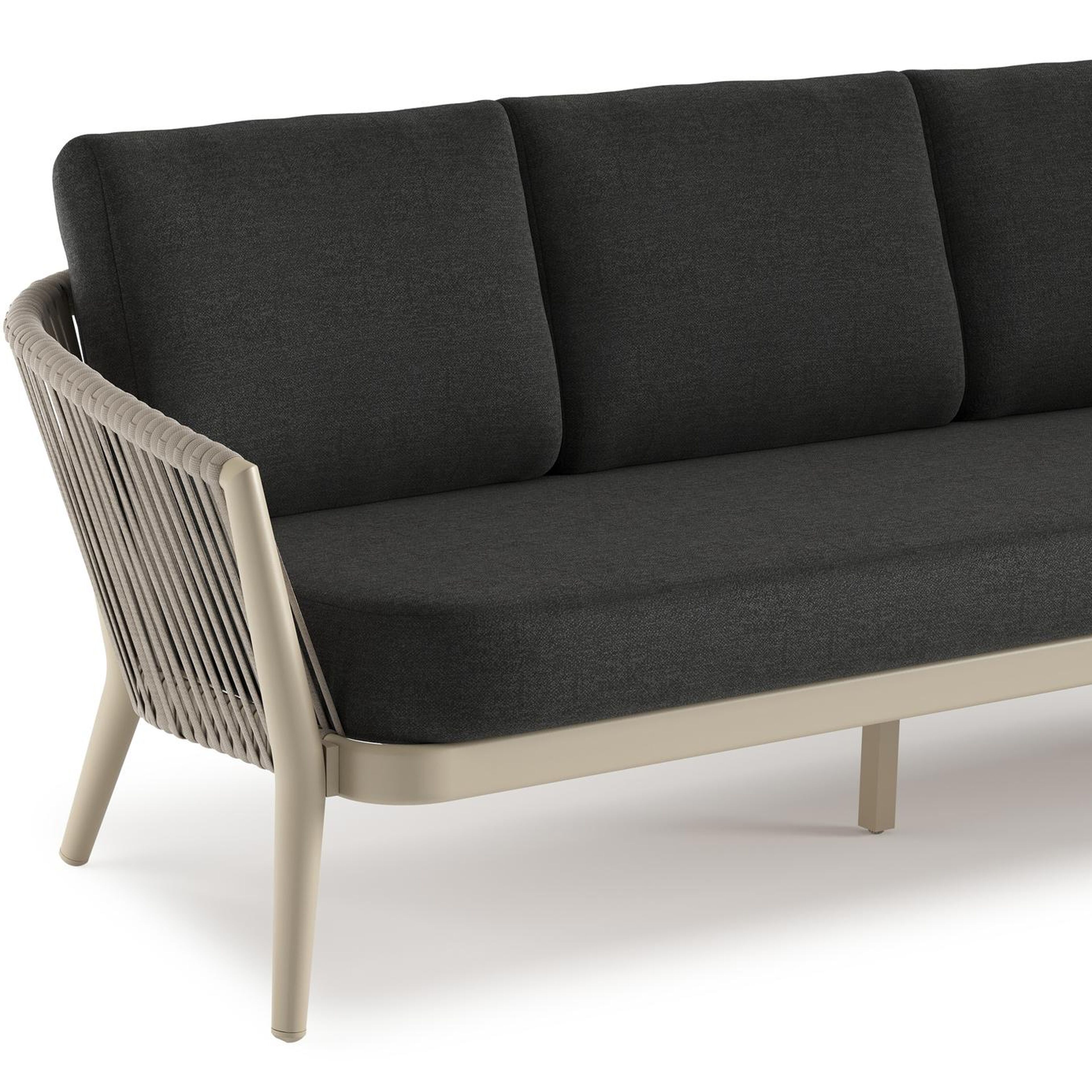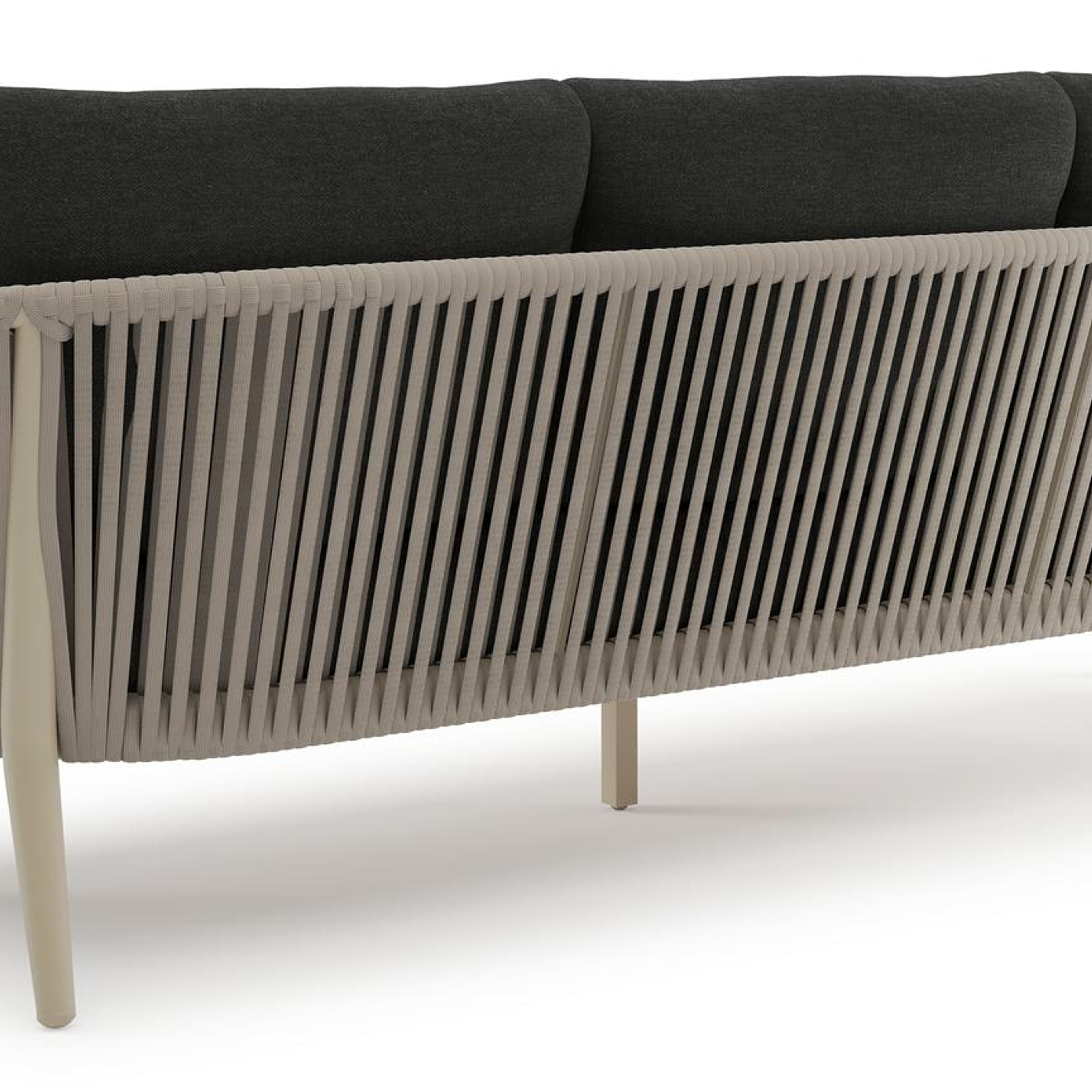 Orso loungebank in beige aluminium en beige verticaal geweven ronde rope met Chartres Sooty all weather sunbrella® luxe kussen | Exterioo tuinmeubelen