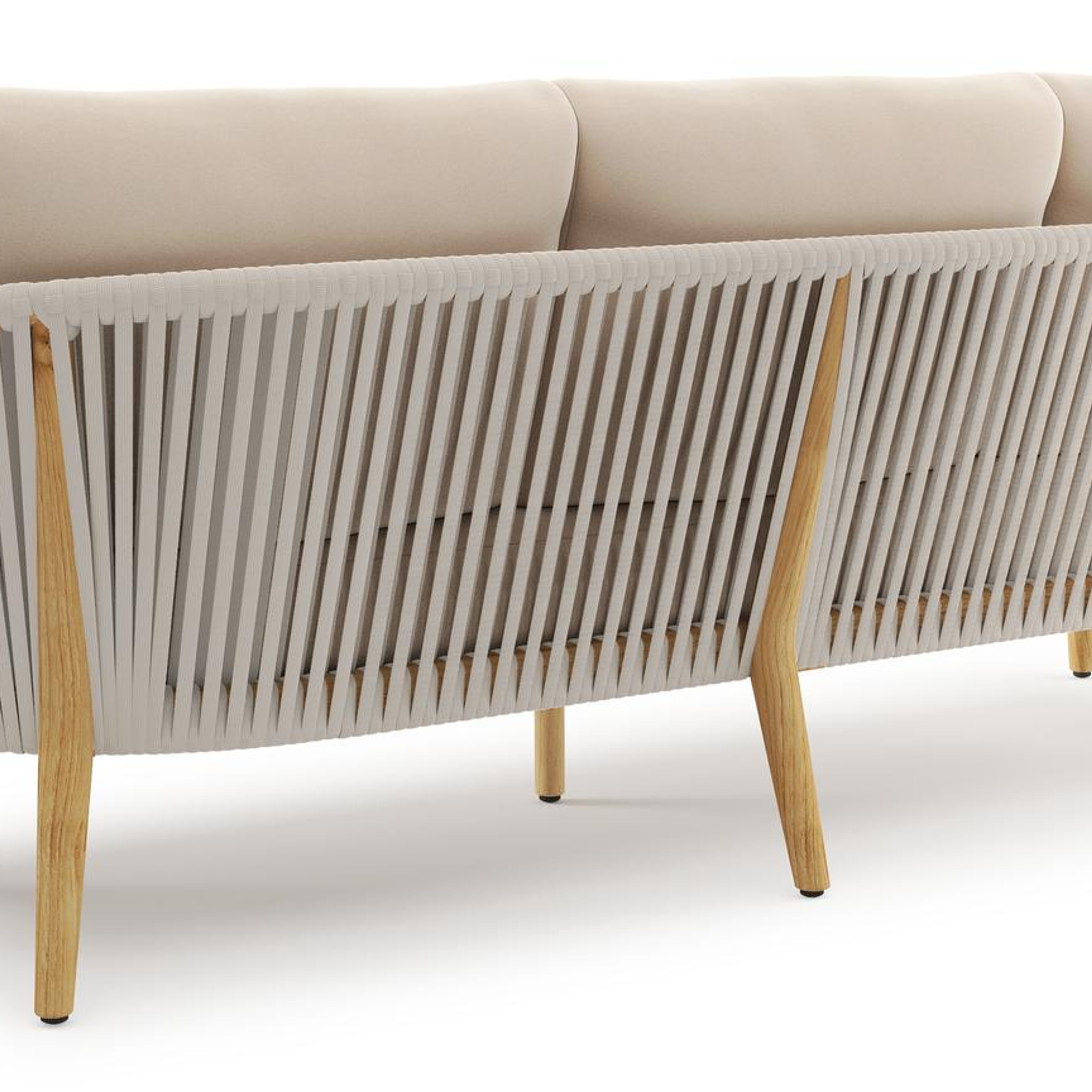 Orso loungebank in teak en beige verticaal geweven luxe vlakke rope met Natte Linen Chalk all weather sunbrella® luxe kussen | Exterioo tuinmeubelen