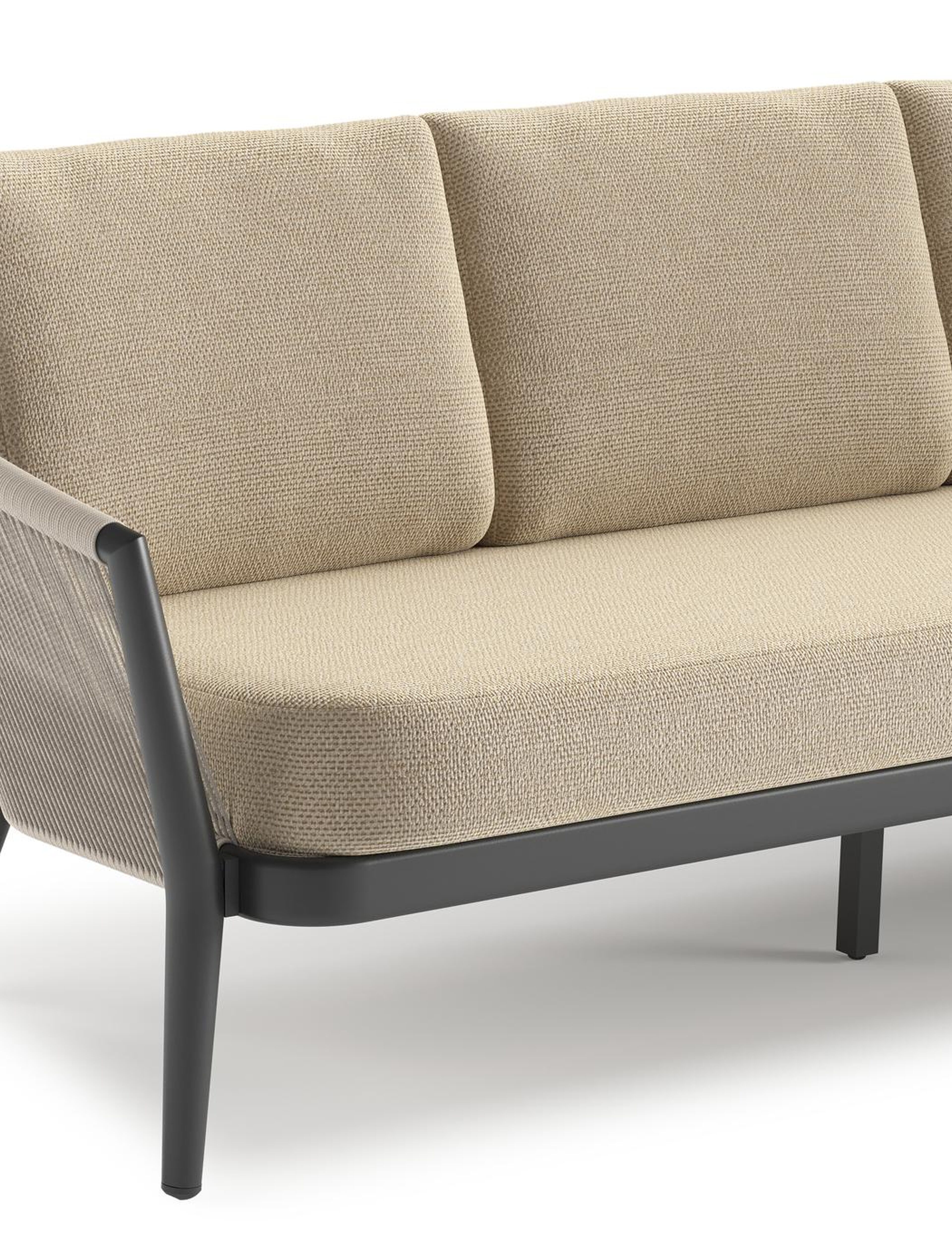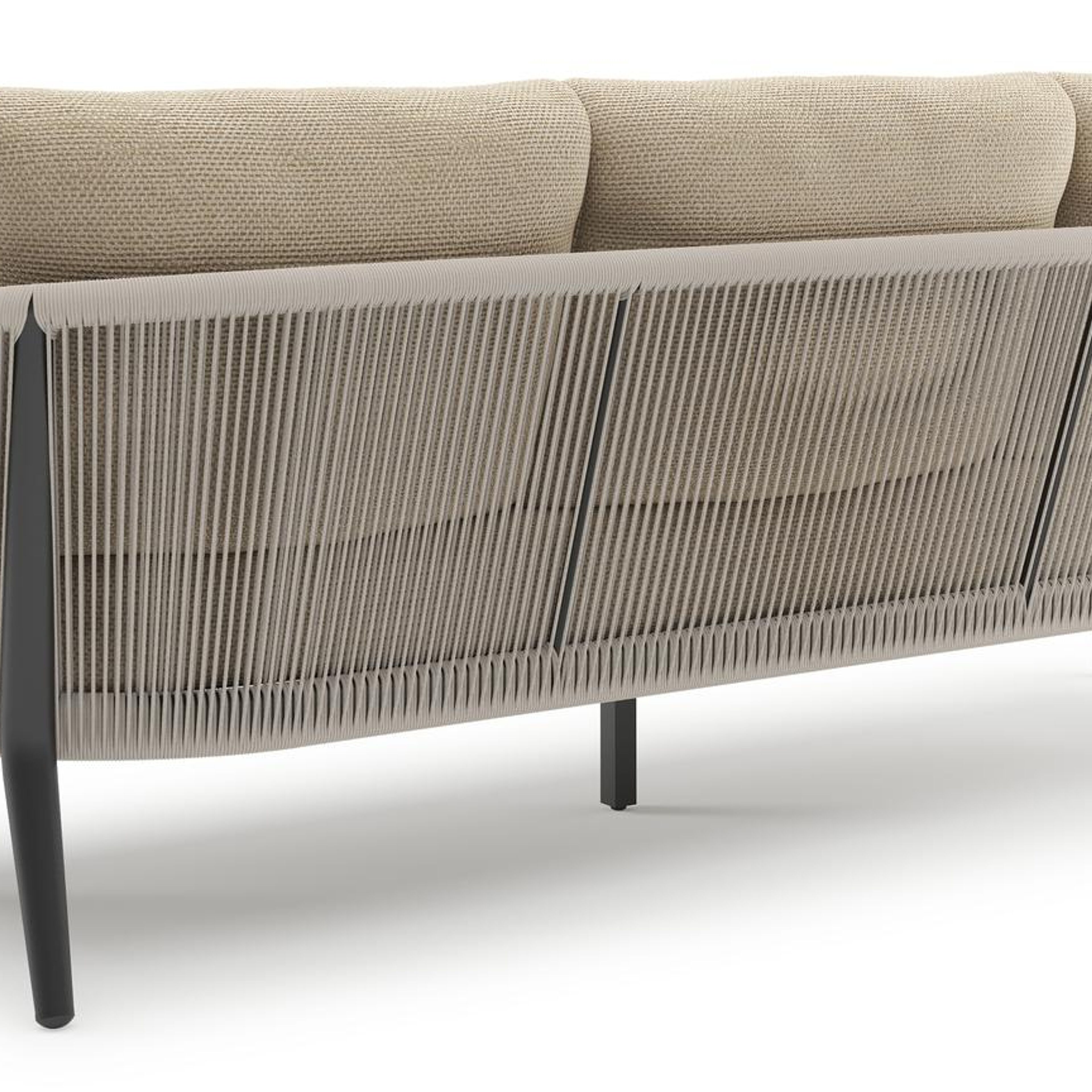 Orso loungebank in zwart aluminium en beige verticaal geweven ronde rope met Althea Camel all weather cosytica kussen | Exterioo tuinmeubelen