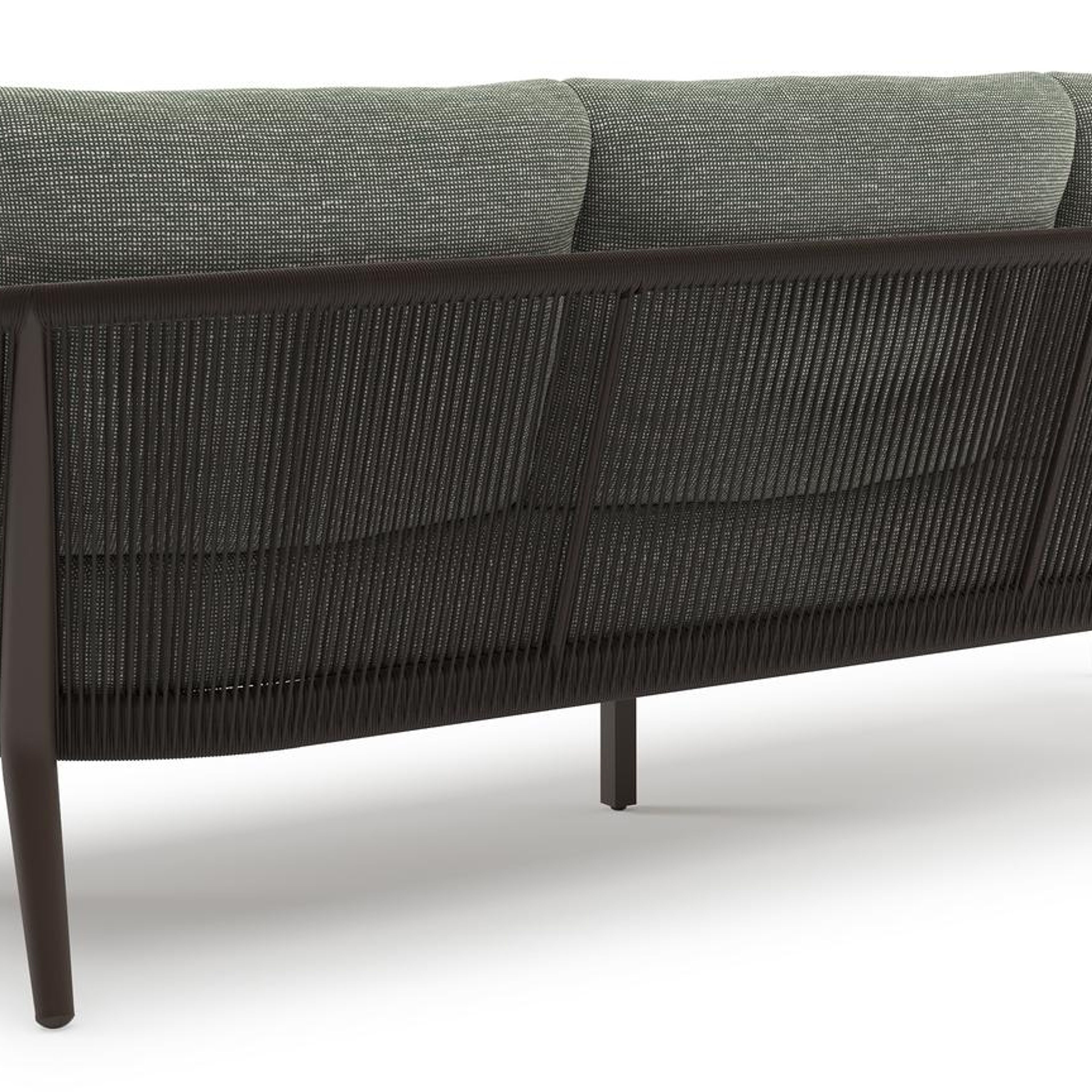 Orso loungeset in donkerbruin aluminium en donkerbruin verticaal geweven ronde rope met Slow Fern all weather sunbrella® luxe kussen | Exterioo tuinmeubelen