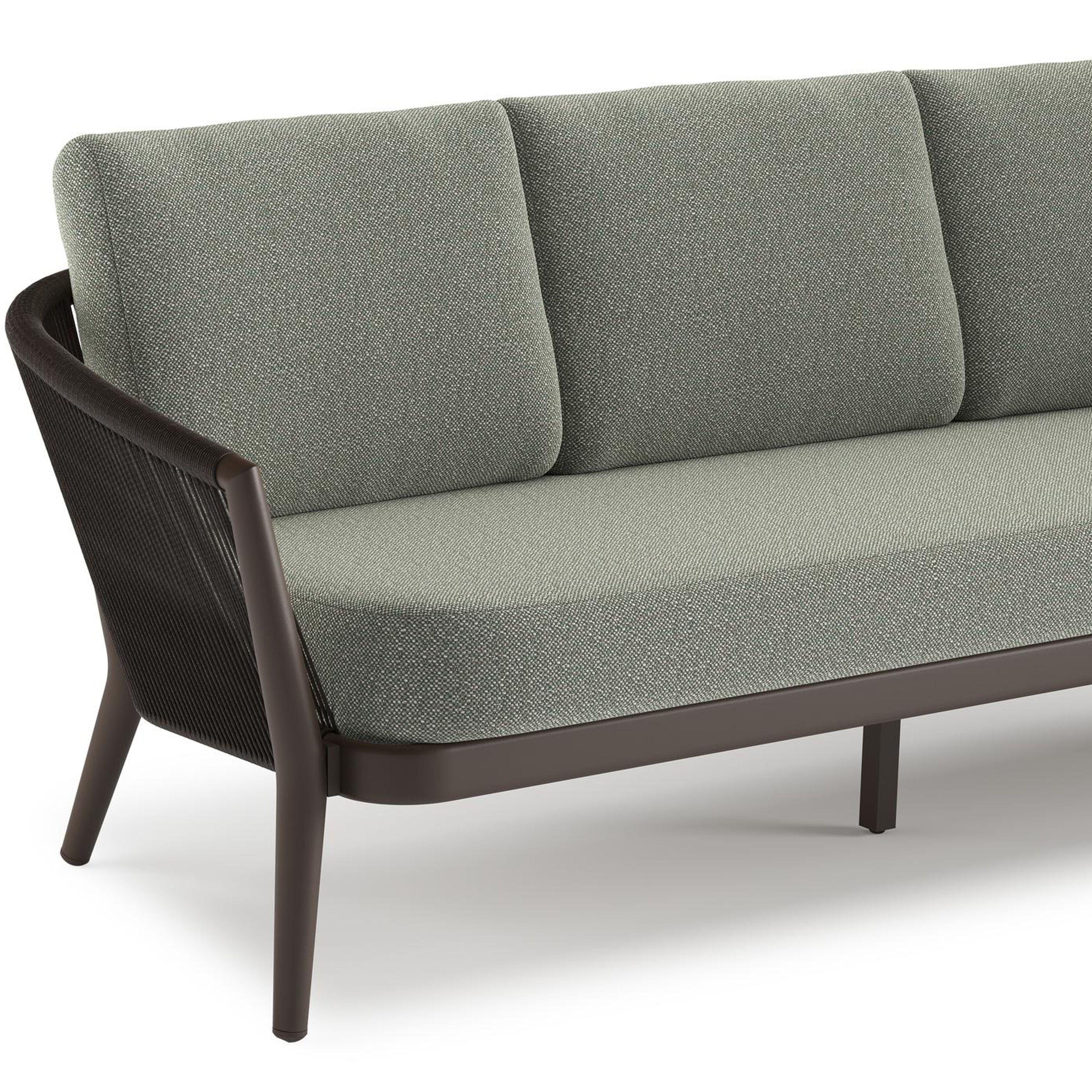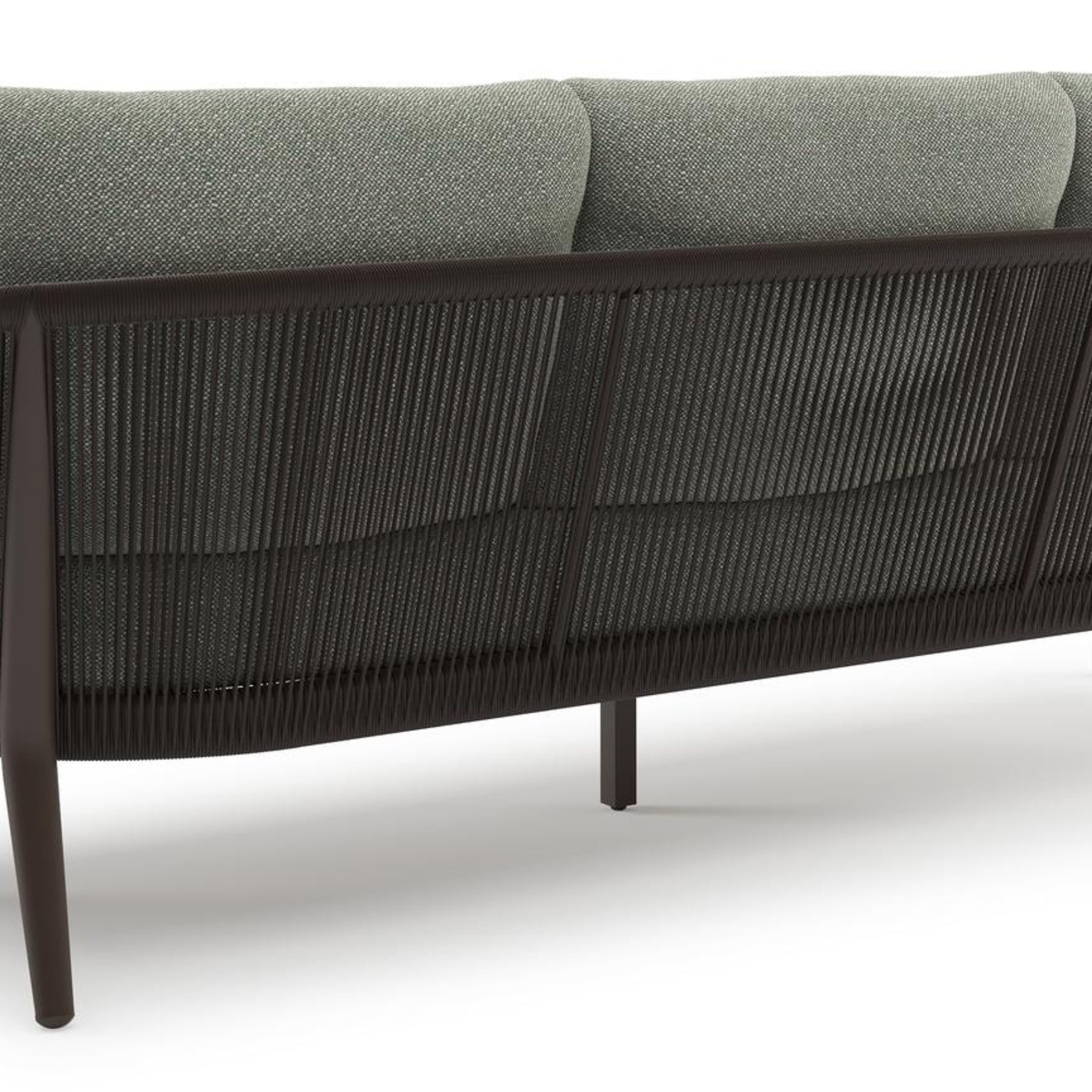 Orso loungeset in donkerbruin aluminium en donkerbruin verticaal geweven ronde rope met Savane Leaf all weather sunbrella® luxe kussen | Exterioo tuinmeubelen