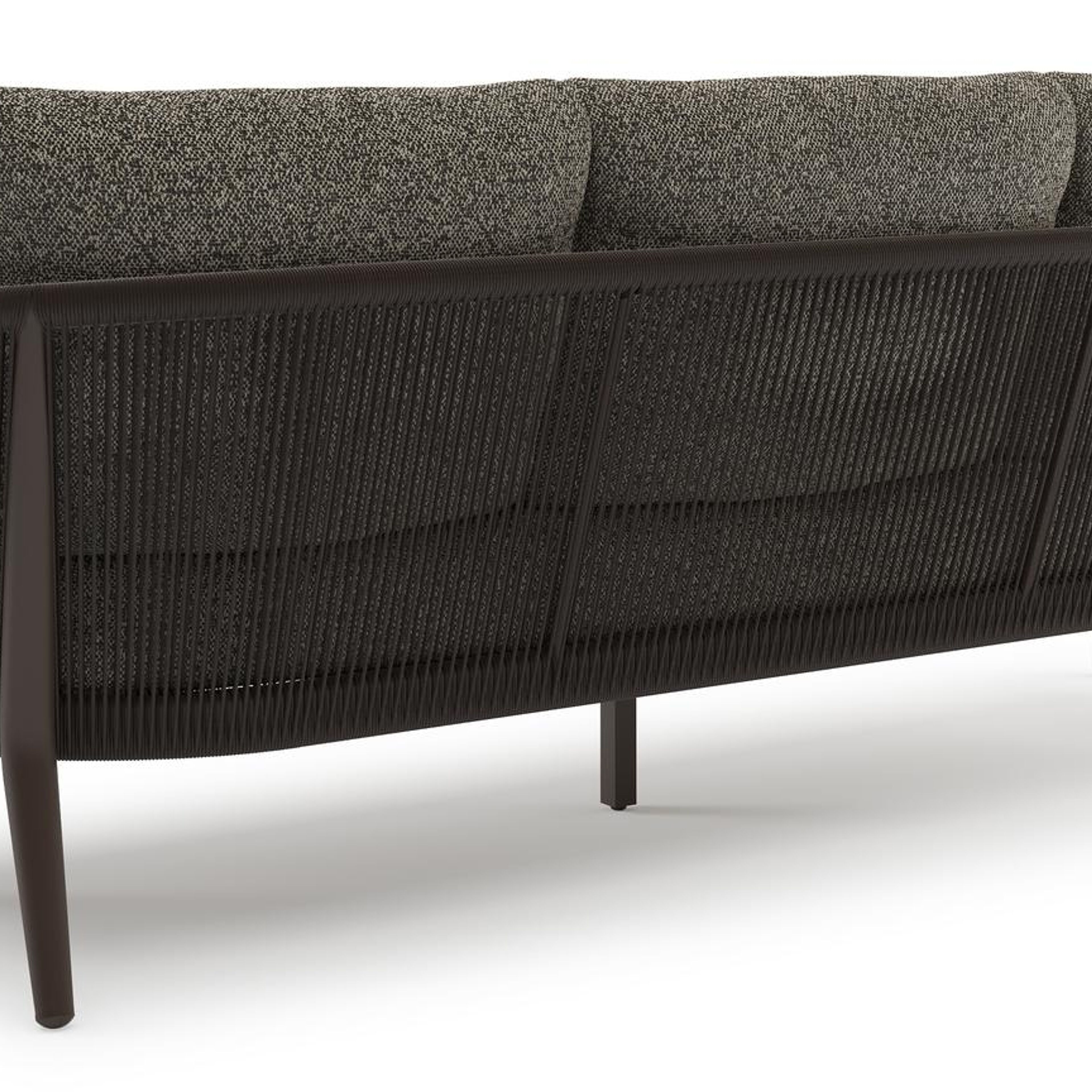Orso loungeset in donkerbruin aluminium en donkerbruin verticaal geweven ronde rope met Marbella Tunder all weather cosytica kussen | Exterioo tuinmeubelen