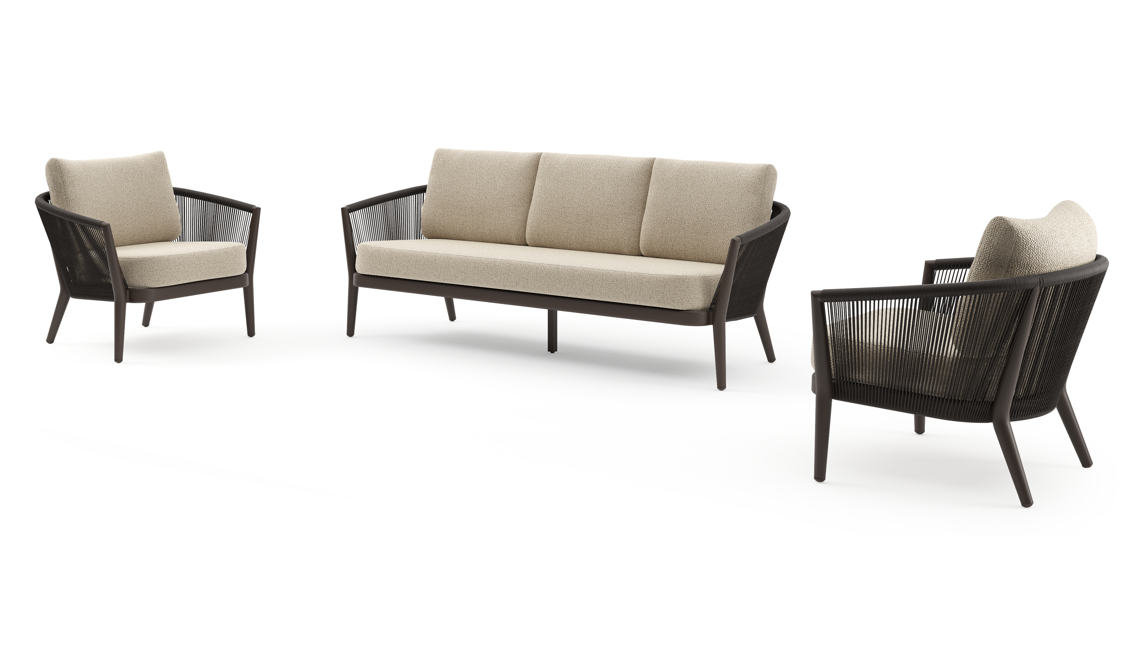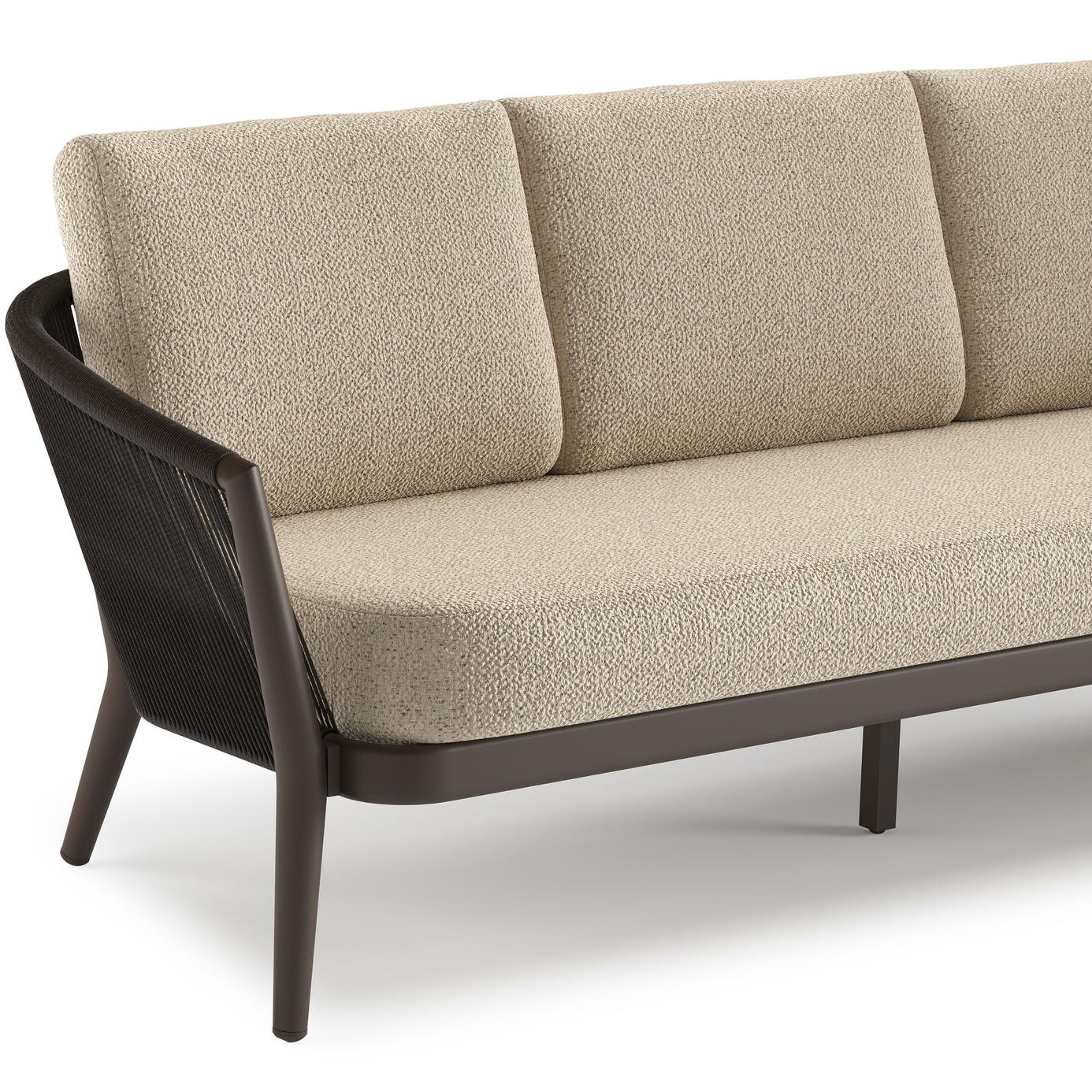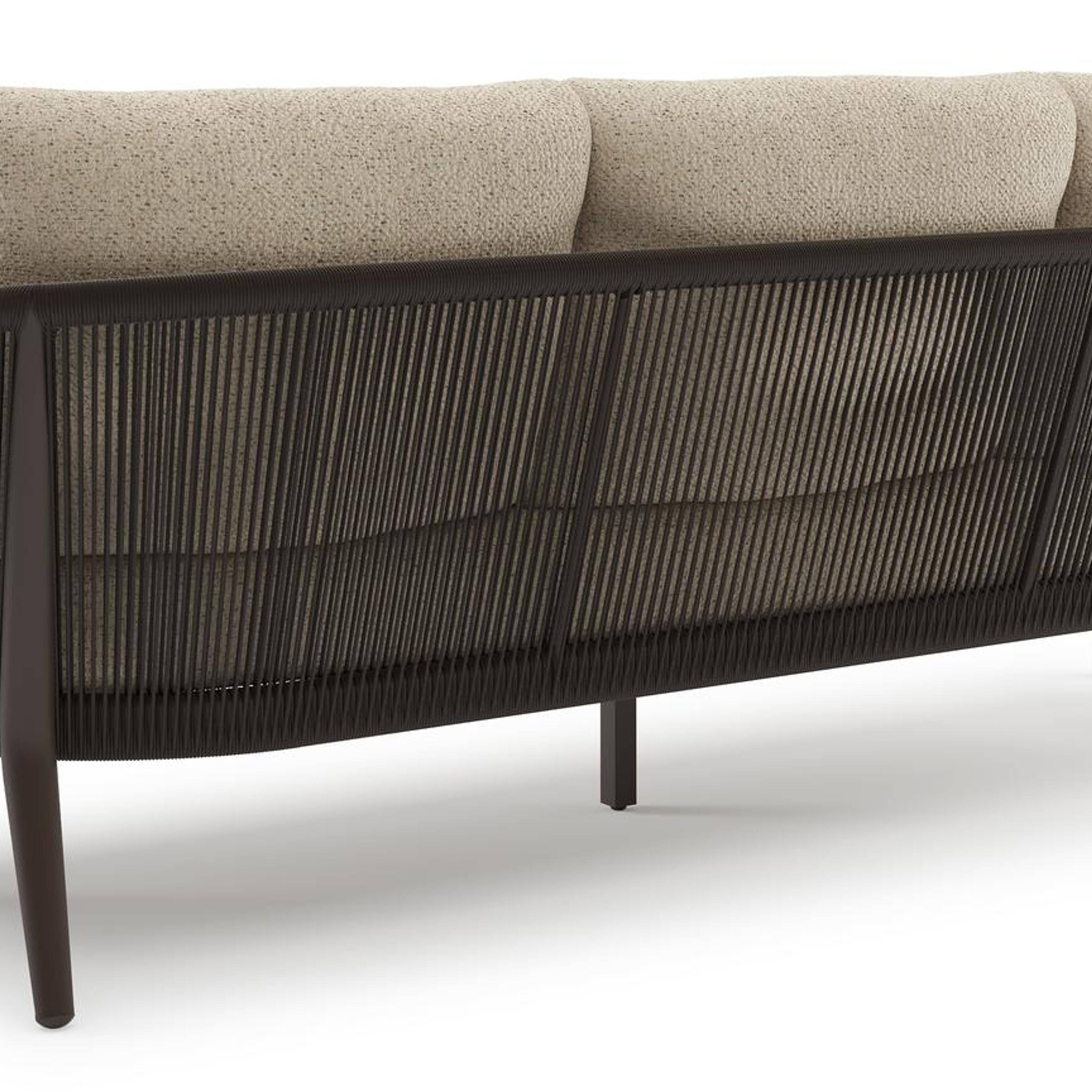 Orso loungeset in donkerbruin aluminium en donkerbruin verticaal geweven ronde rope met Bora Forest all weather cosytica kussen | Exterioo tuinmeubelen