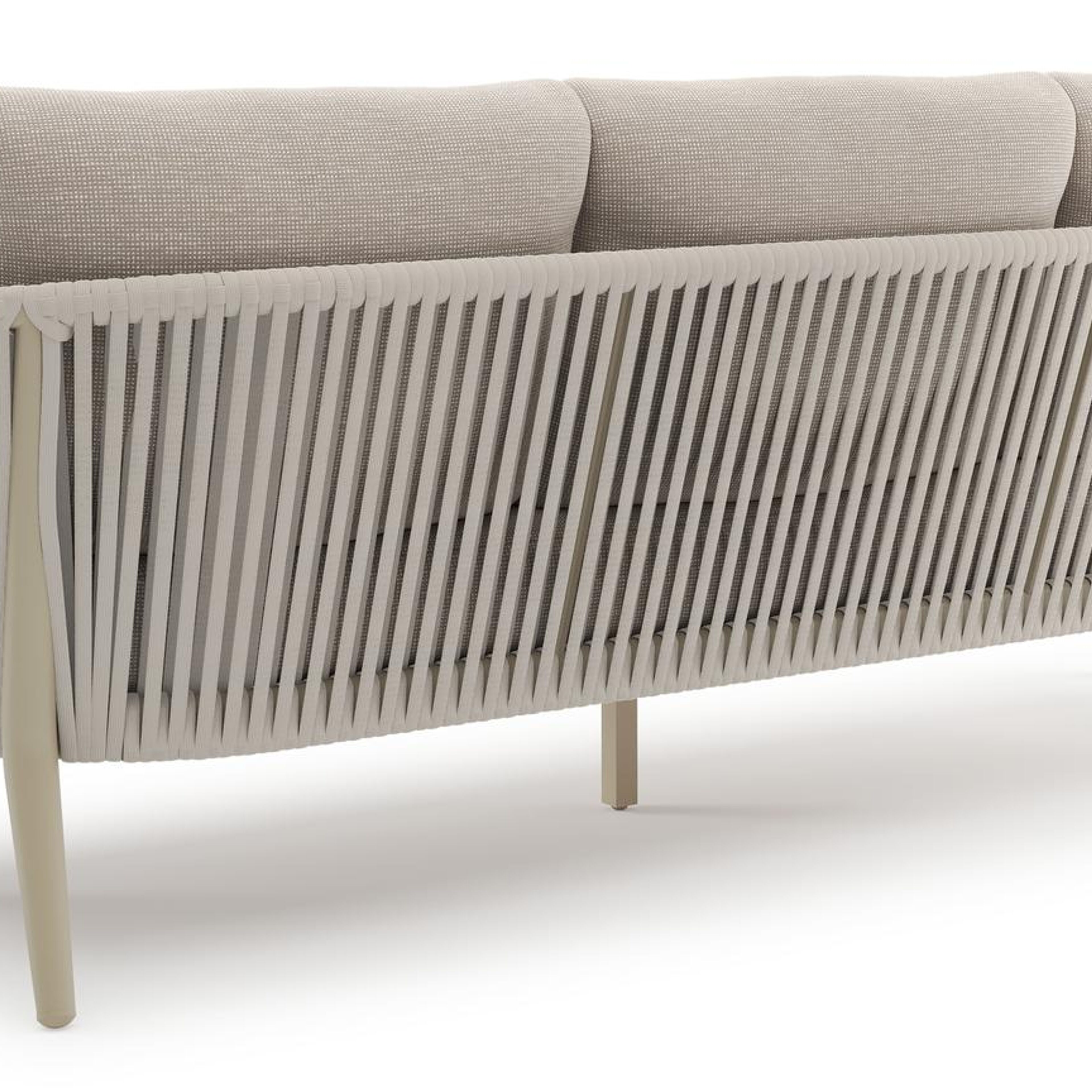 Orso loungeset in beige aluminium en beige verticaal geweven ronde rope met Slow Farafra all weather sunbrella® luxe kussen | Exterioo tuinmeubelen