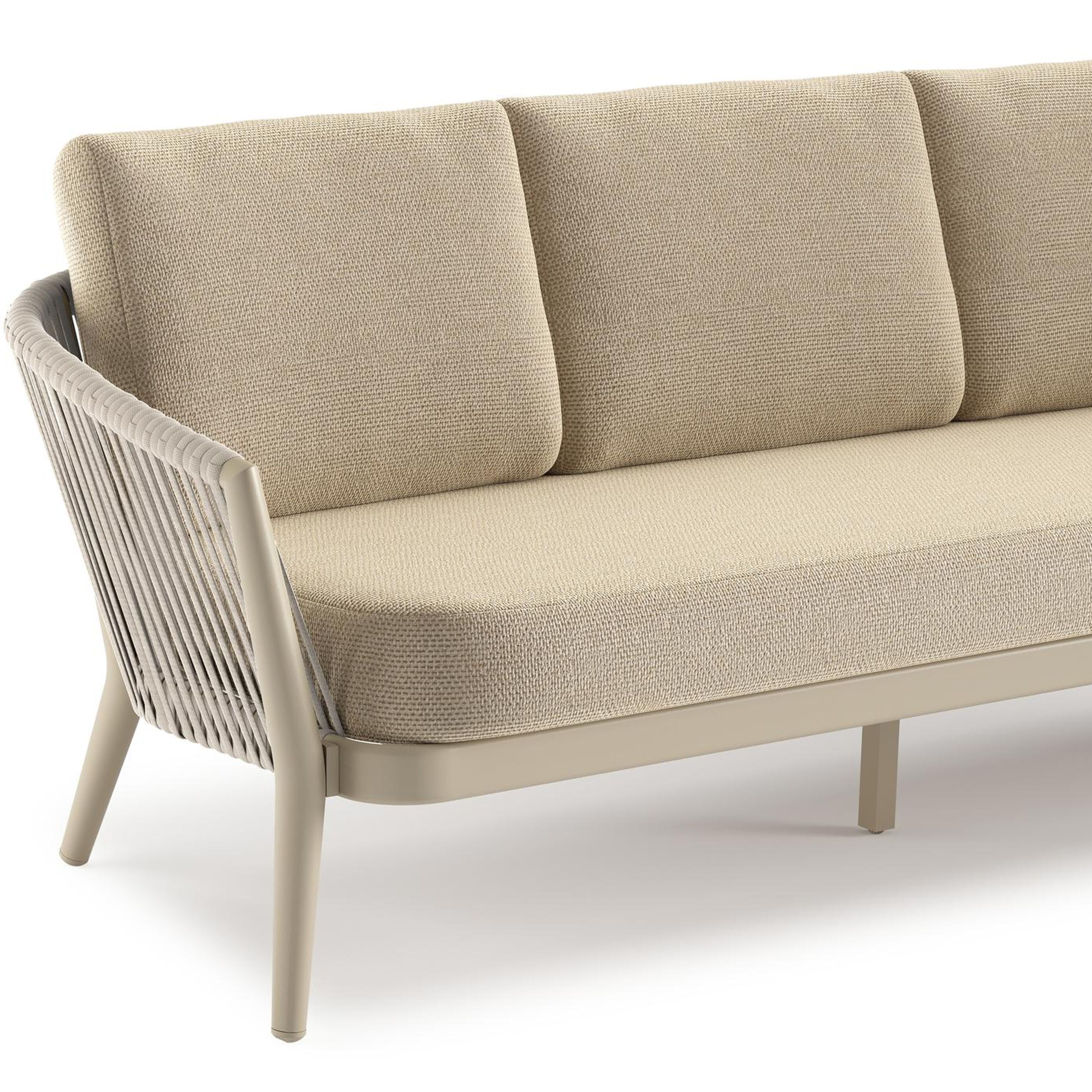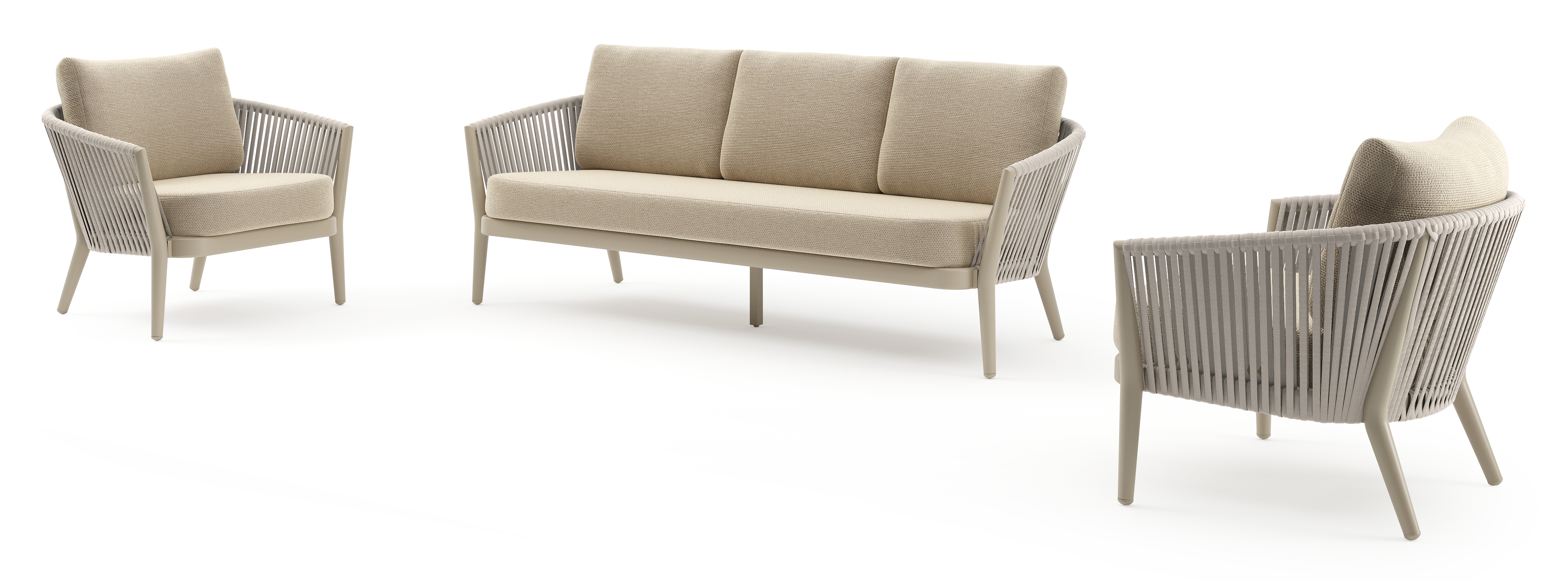 Orso loungeset in beige aluminium en beige verticaal geweven ronde rope met Althea Camel all weather cosytica kussen | Exterioo tuinmeubelen