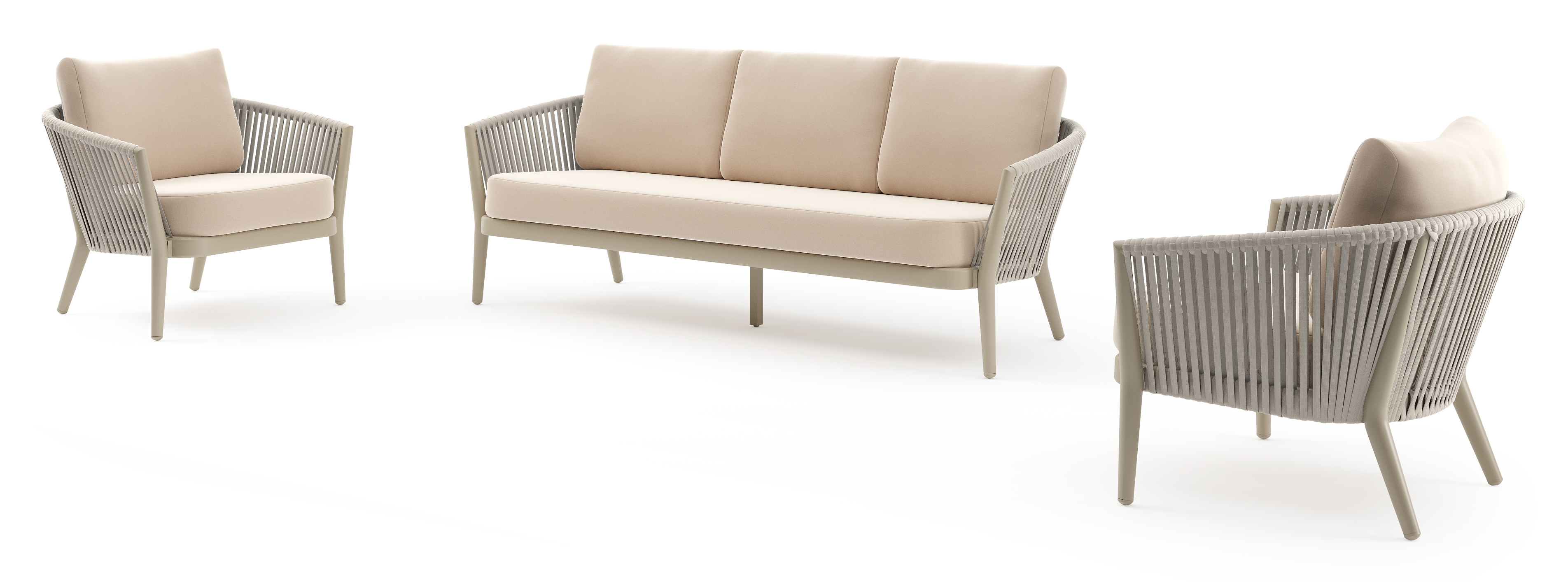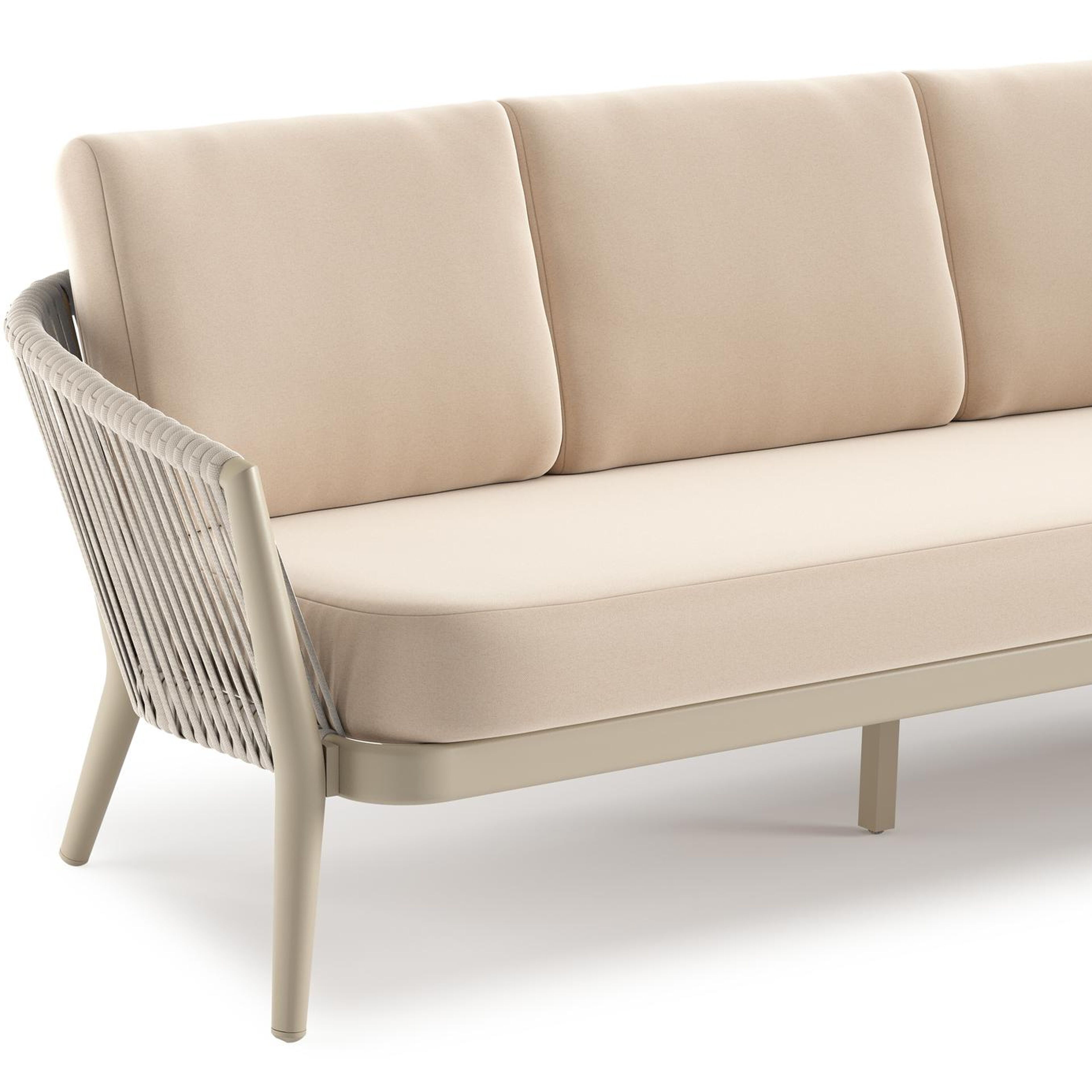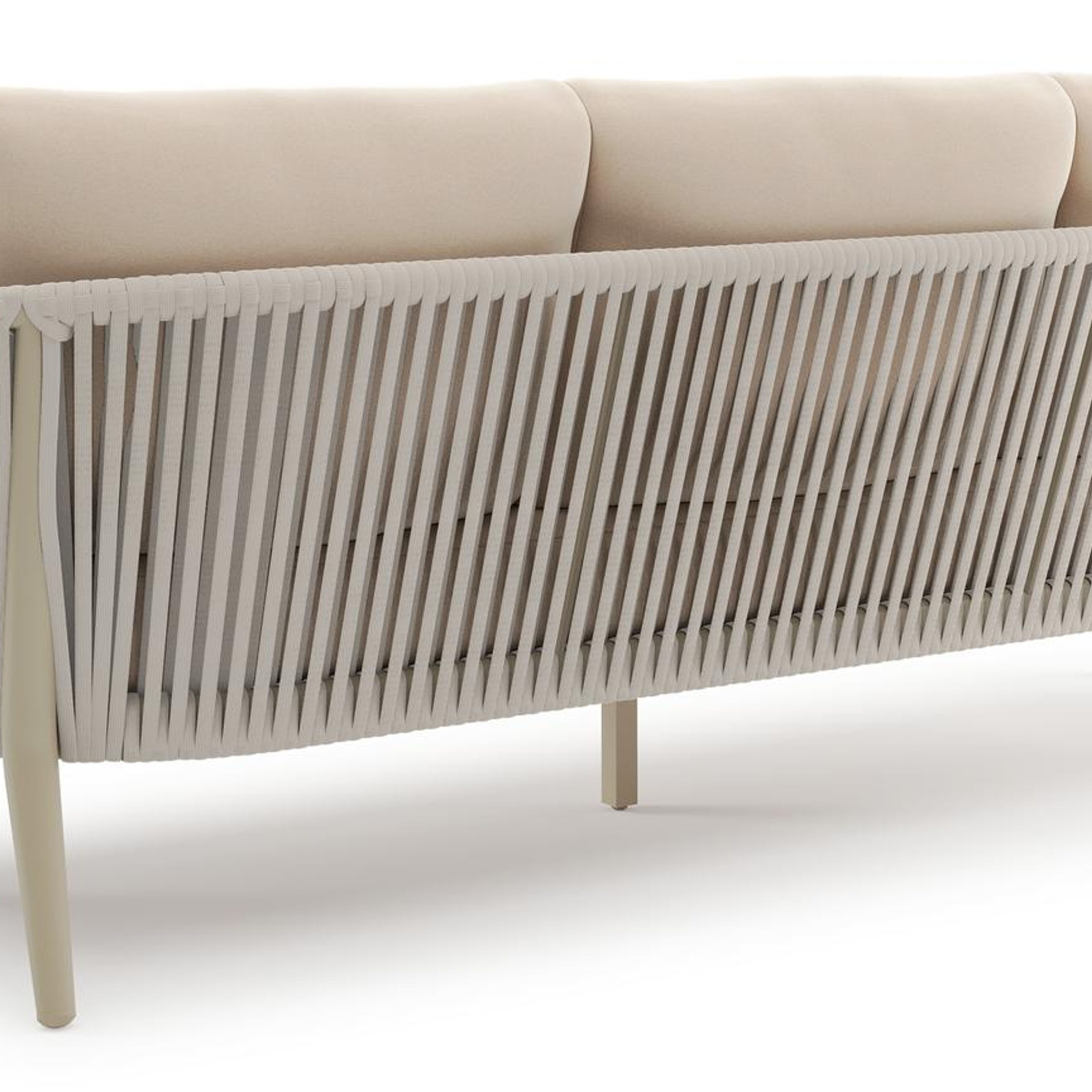 Orso loungeset in beige aluminium en beige verticaal geweven ronde rope met Natte Linen Chalk all weather sunbrella® luxe kussen | Exterioo tuinmeubelen