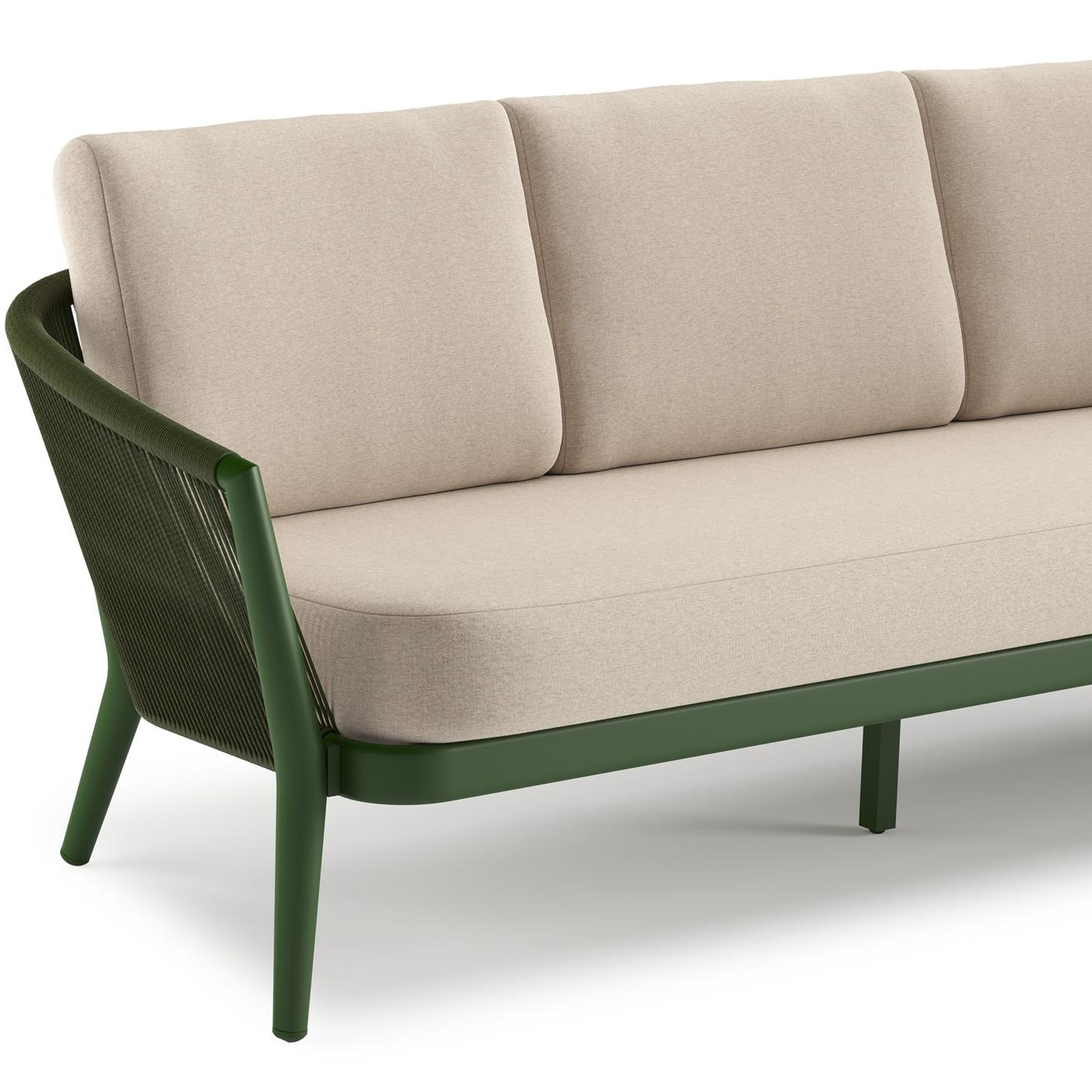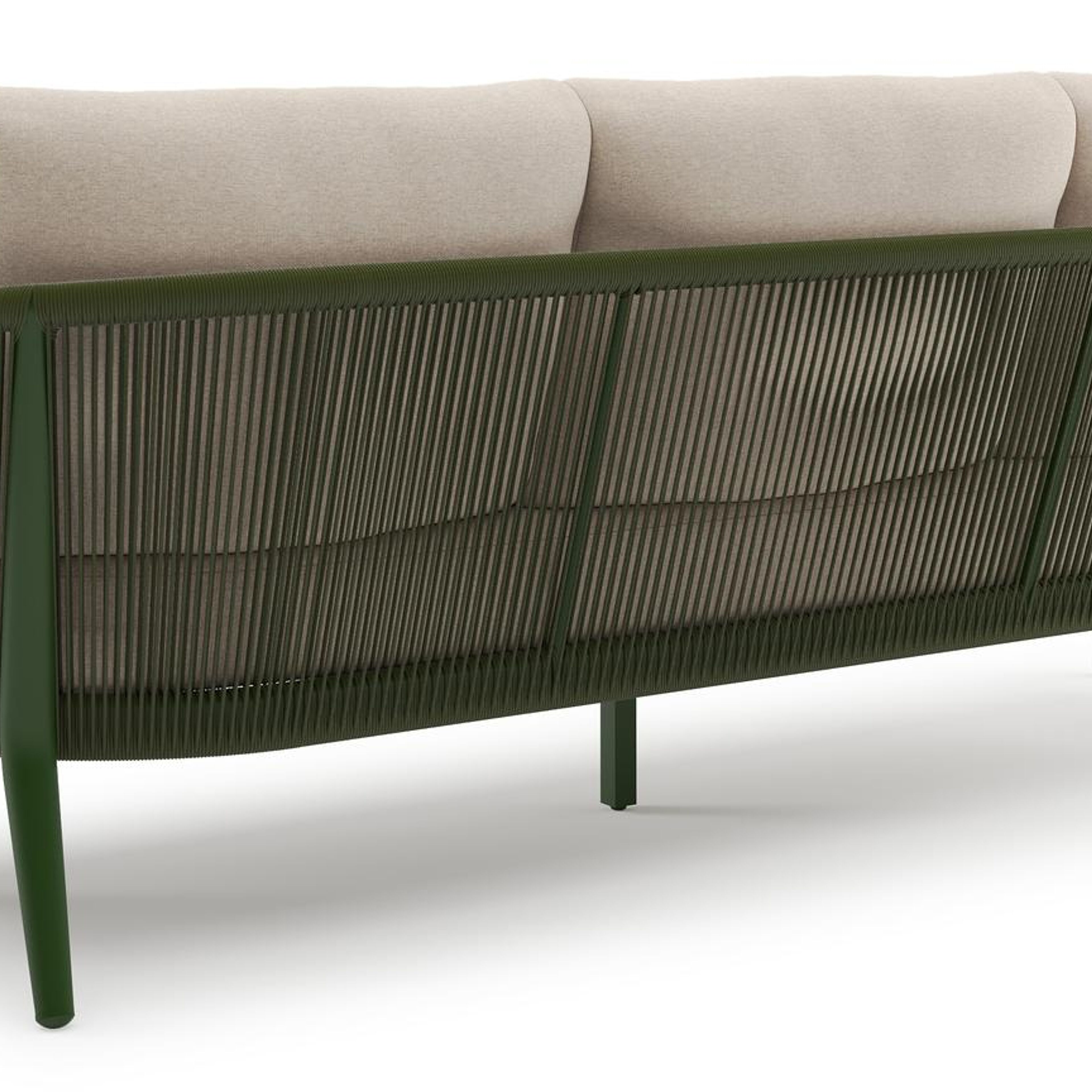 Orso loungeset in groen aluminium en groen verticaal geweven ronde rope met Heritage Ash all weather sunbrella® luxe kussen | Exterioo tuinmeubelen