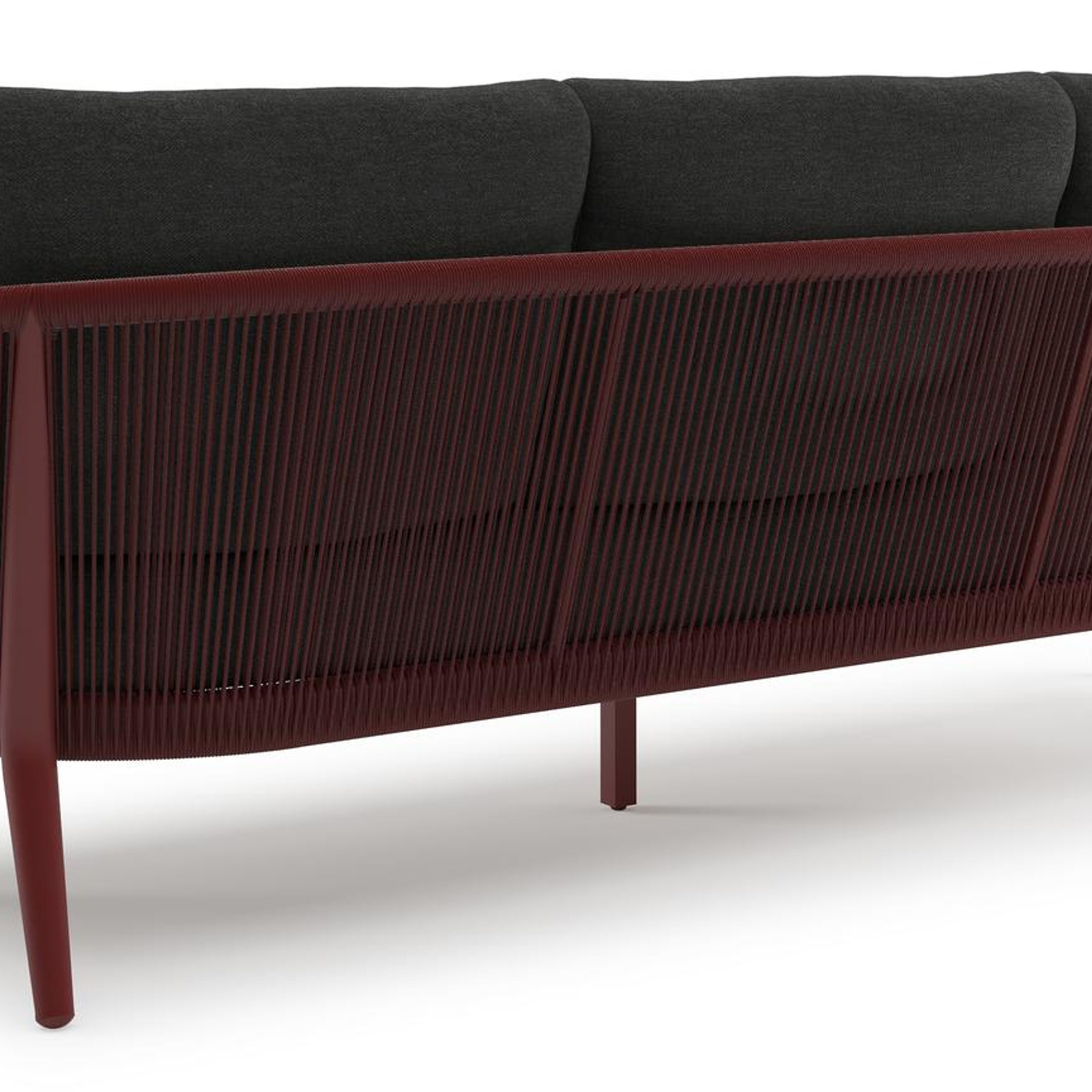 Orso loungeset in ruby aluminium en ruby verticaal geweven ronde rope met Chartres Sooty all weather sunbrella® luxe kussen | Exterioo tuinmeubelen