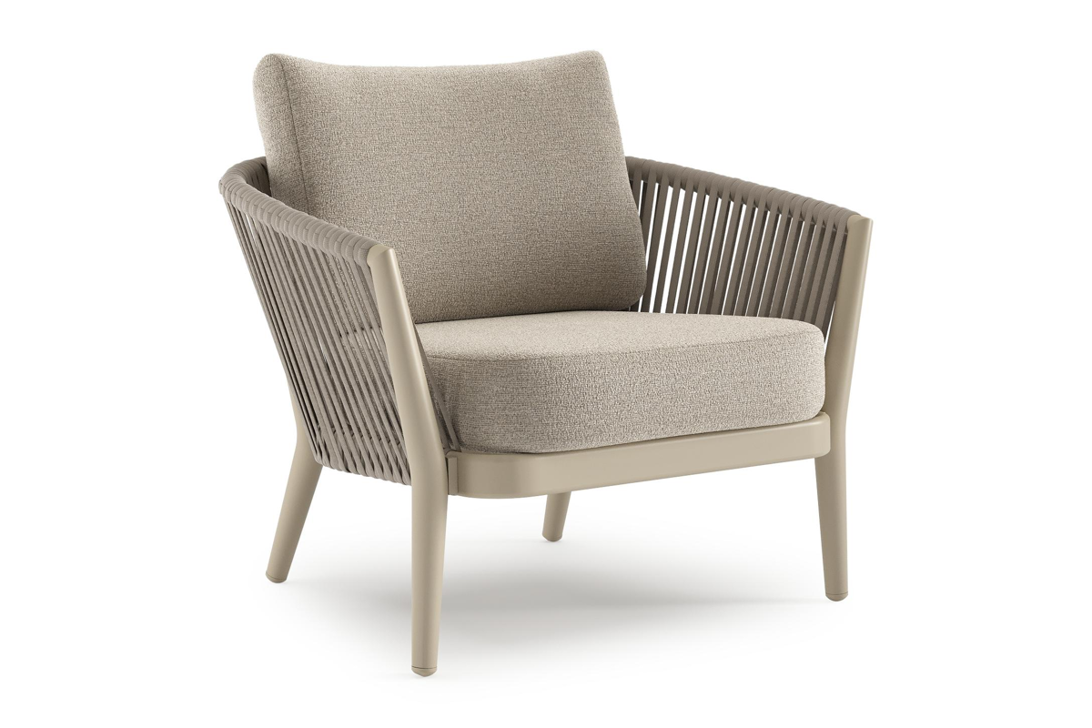 Orso loungestoel in beige aluminium en beige verticaal geweven ronde rope met Catania Sand all weather cosytica kussen | Exterioo