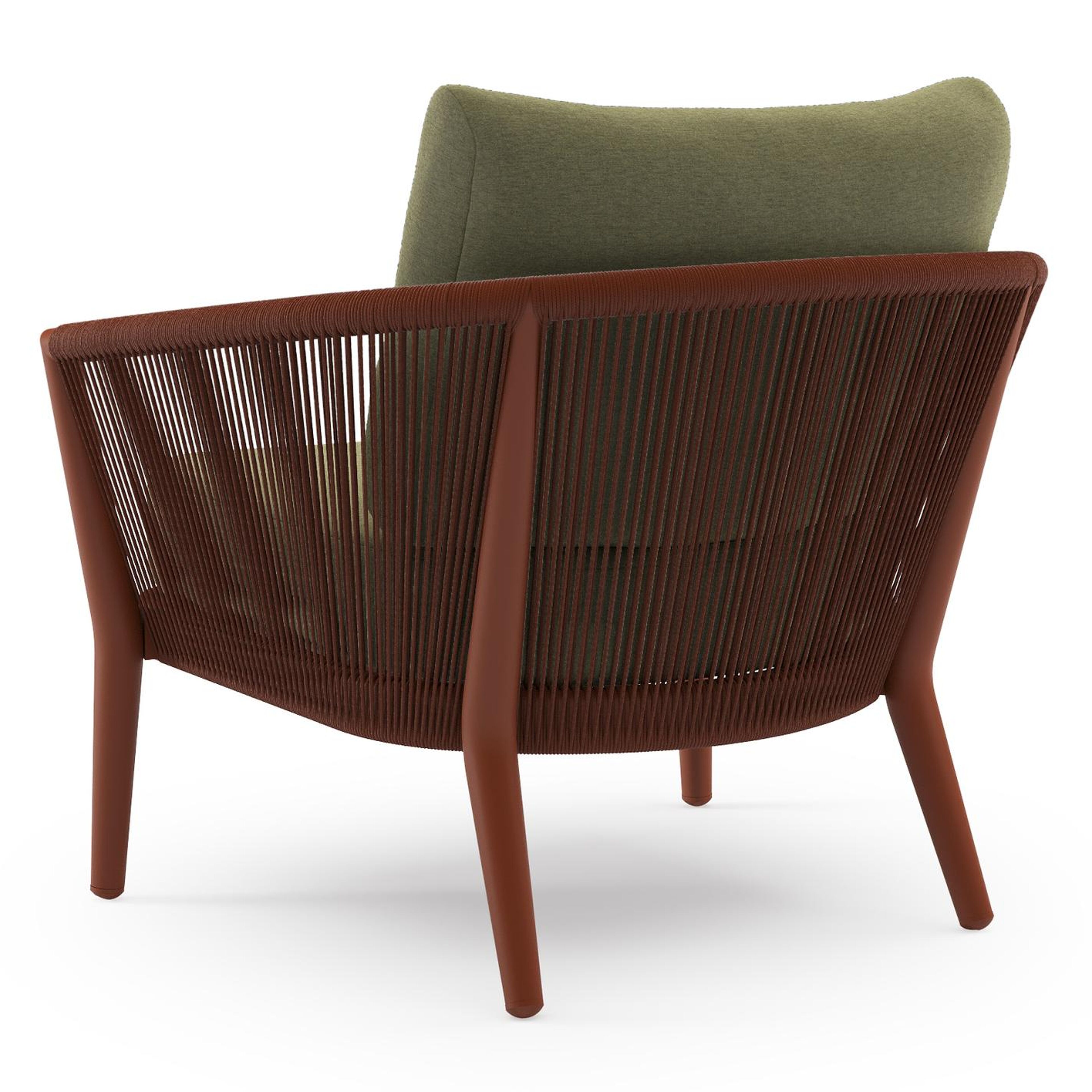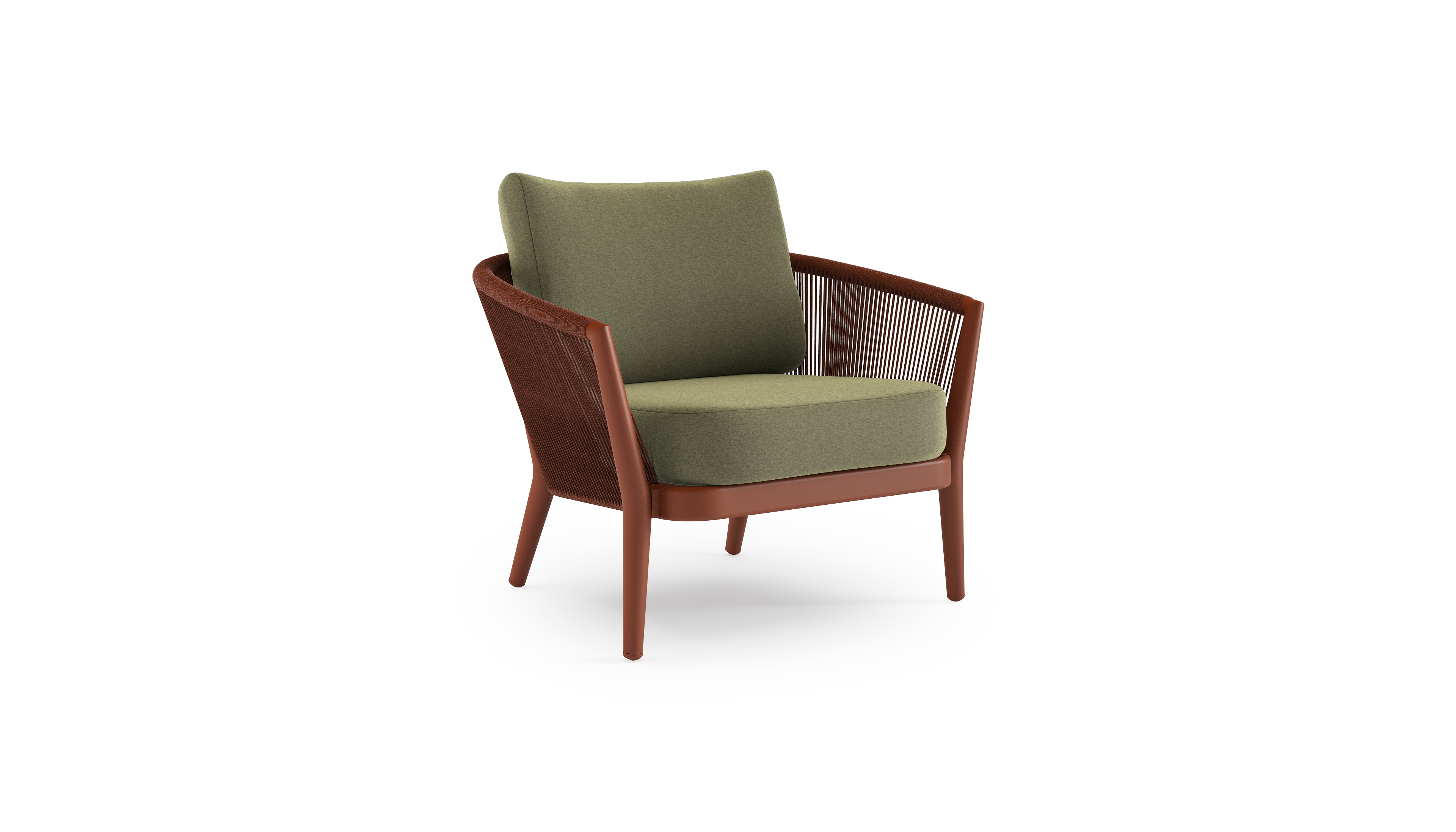 Orso loungestoel in roestbruin aluminium en roestbruin verticaal geweven ronde rope met Heritage Leaf all weather sunbrella® luxe kussen | Exterioo tuinmeubelen