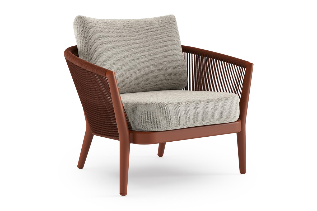Orso loungestoel in roestbruin aluminium en roestbruin verticaal geweven ronde rope met Firenze Sand all weather solica kussen | Exterioo
