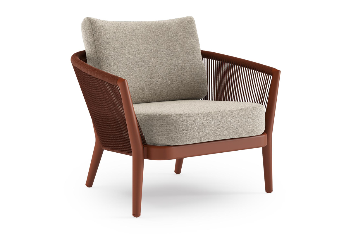 Orso loungestoel in roestbruin aluminium en roestbruin verticaal geweven ronde rope met Catania Sand all weather cosytica kussen | Exterioo
