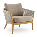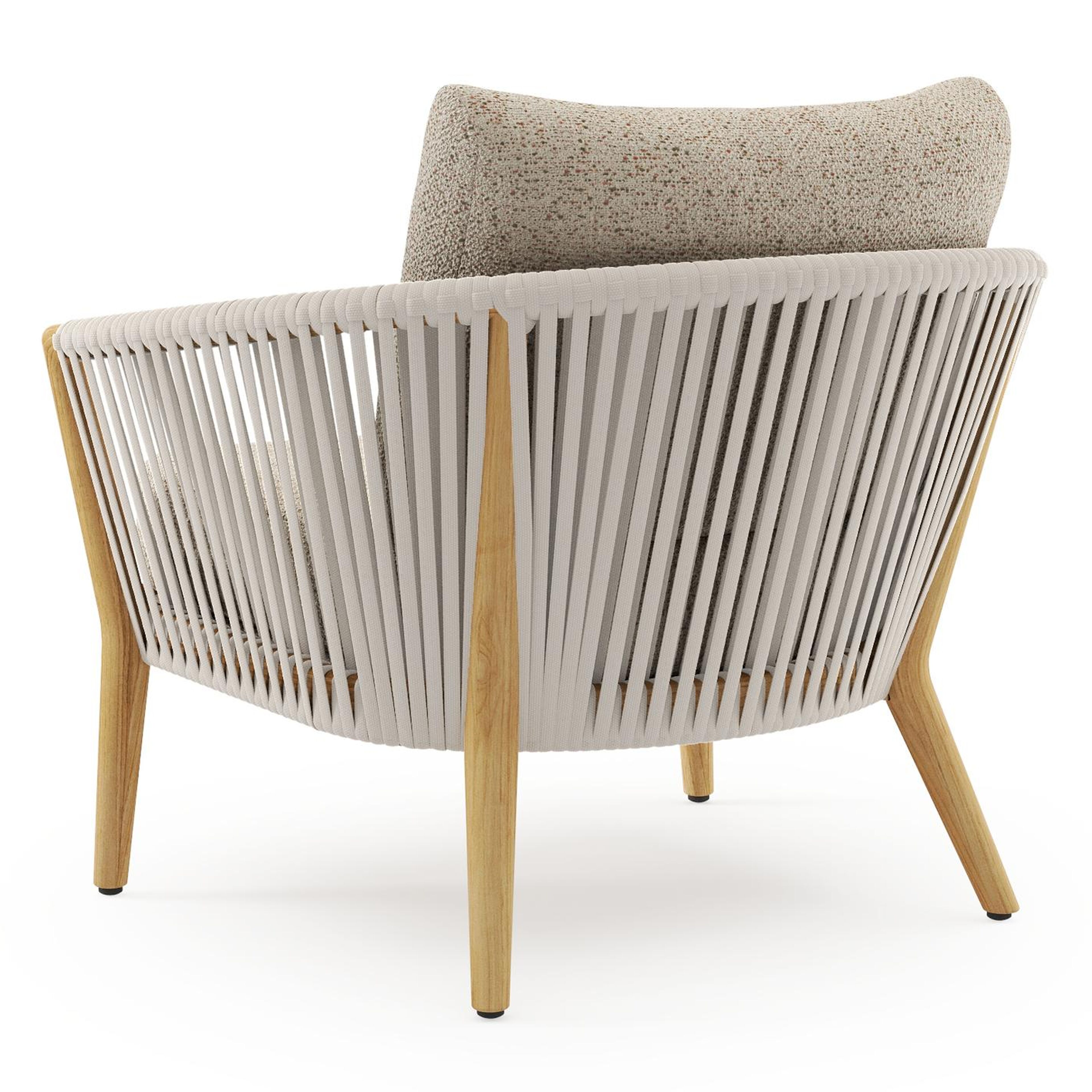 Orso loungestoel in teak en beige verticaal geweven luxe vlakke rope met Bora Jungle all weather cosytica kussen | Exterioo tuinmeubelen