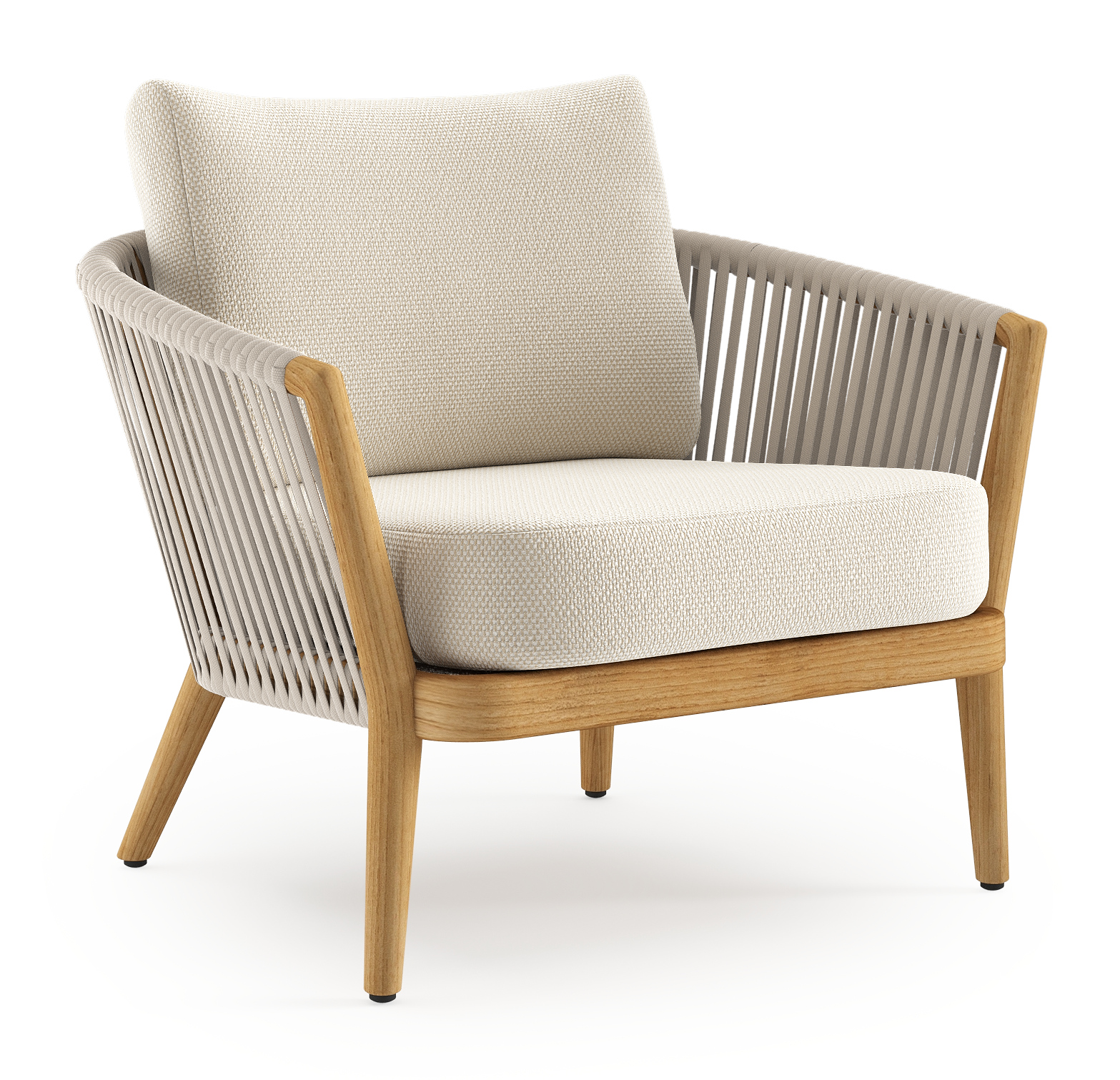 Orso loungestoel in teak en beige verticaal geweven luxe vlakke rope met Althea Off White all weather cosytica kussen | Exterioo tuinmeubelen