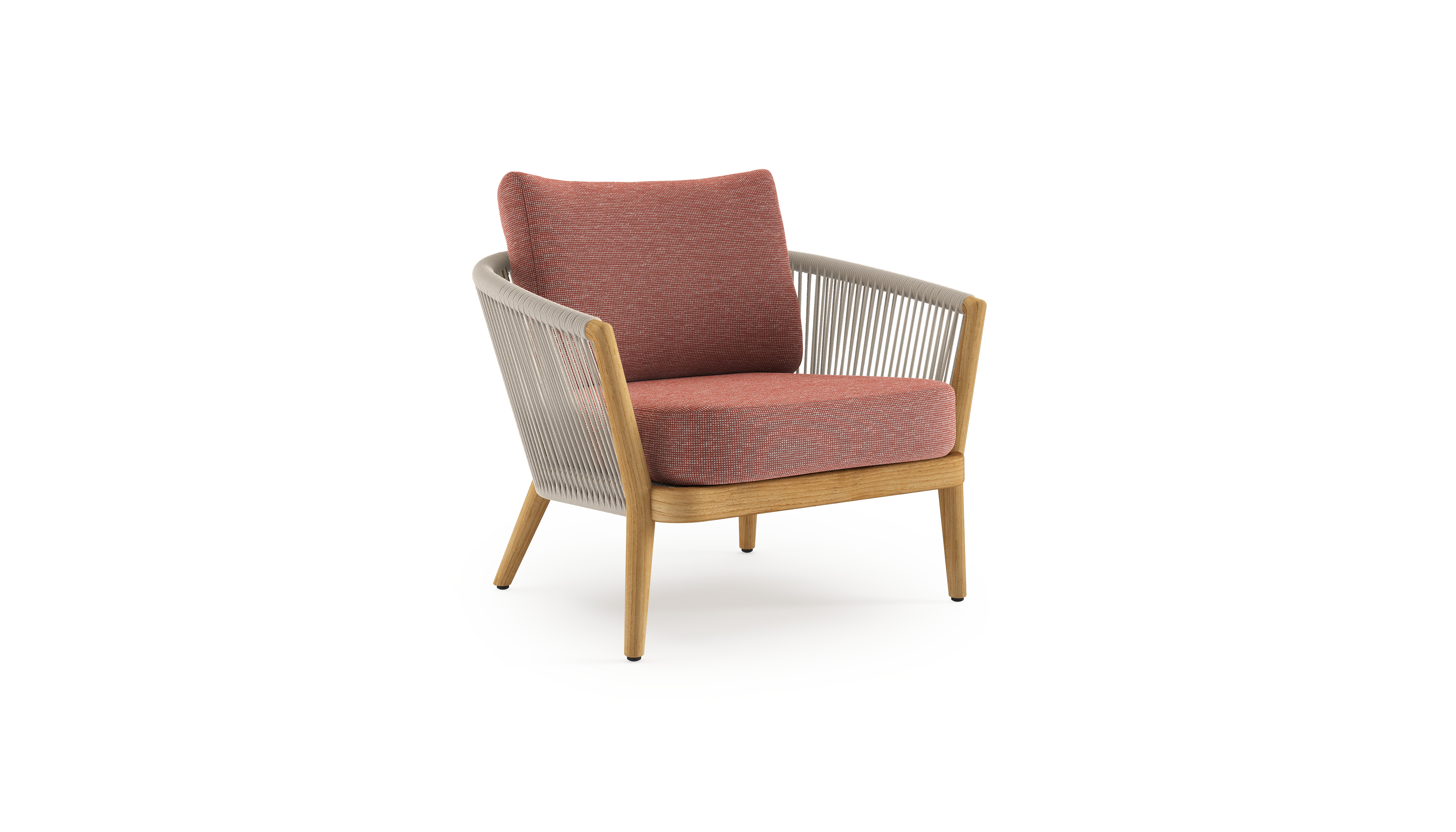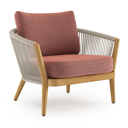Orso loungestoel in teak en beige verticaal geweven ronde rope met Slow Alezan all weather sunbrella® luxe kussen | Exterioo tuinmeubelen