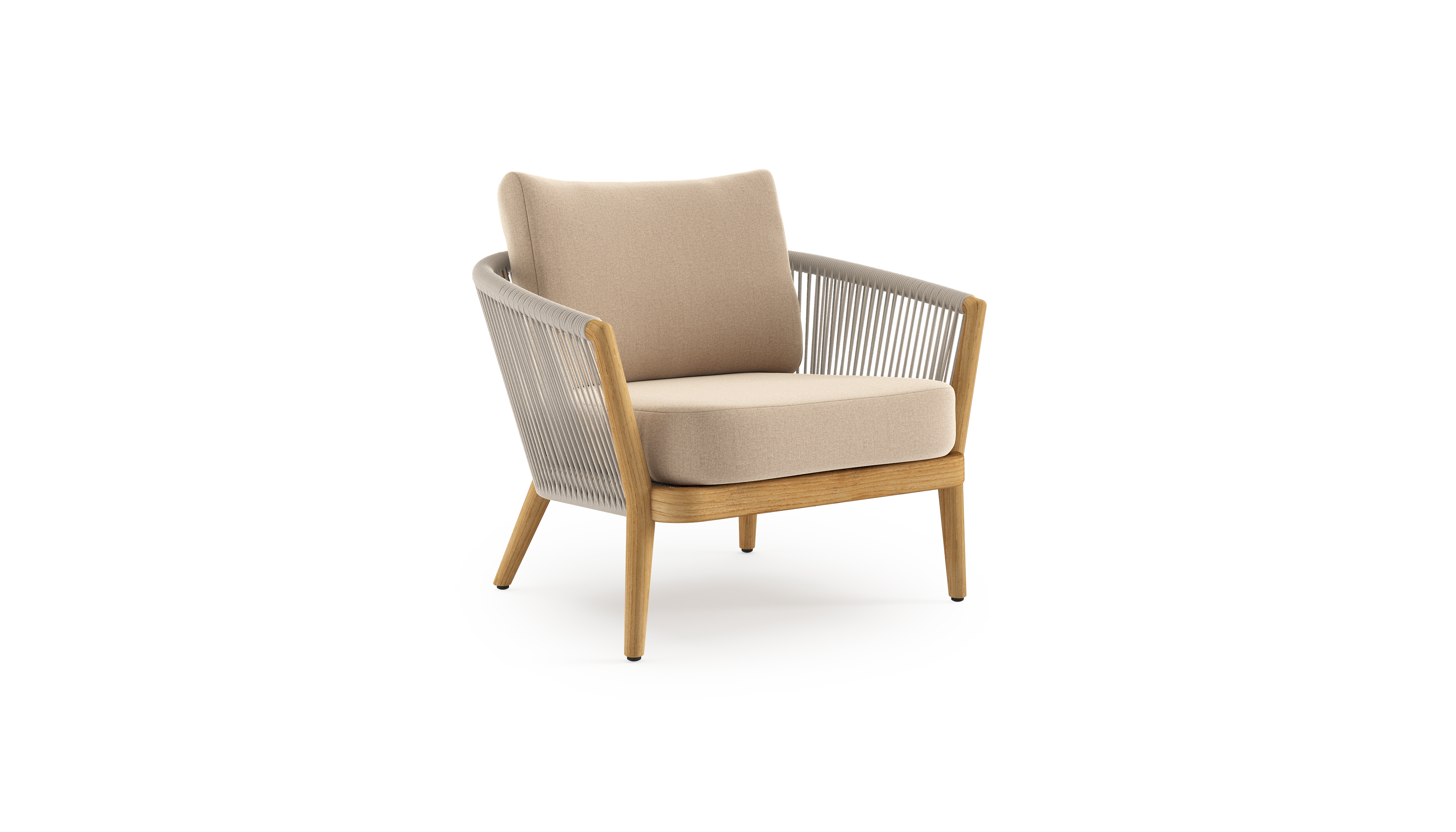 Orso loungestoel in teak en beige verticaal geweven ronde rope met Natte Heather Beige all weather sunbrella® luxe kussen | Exterioo tuinmeubelen