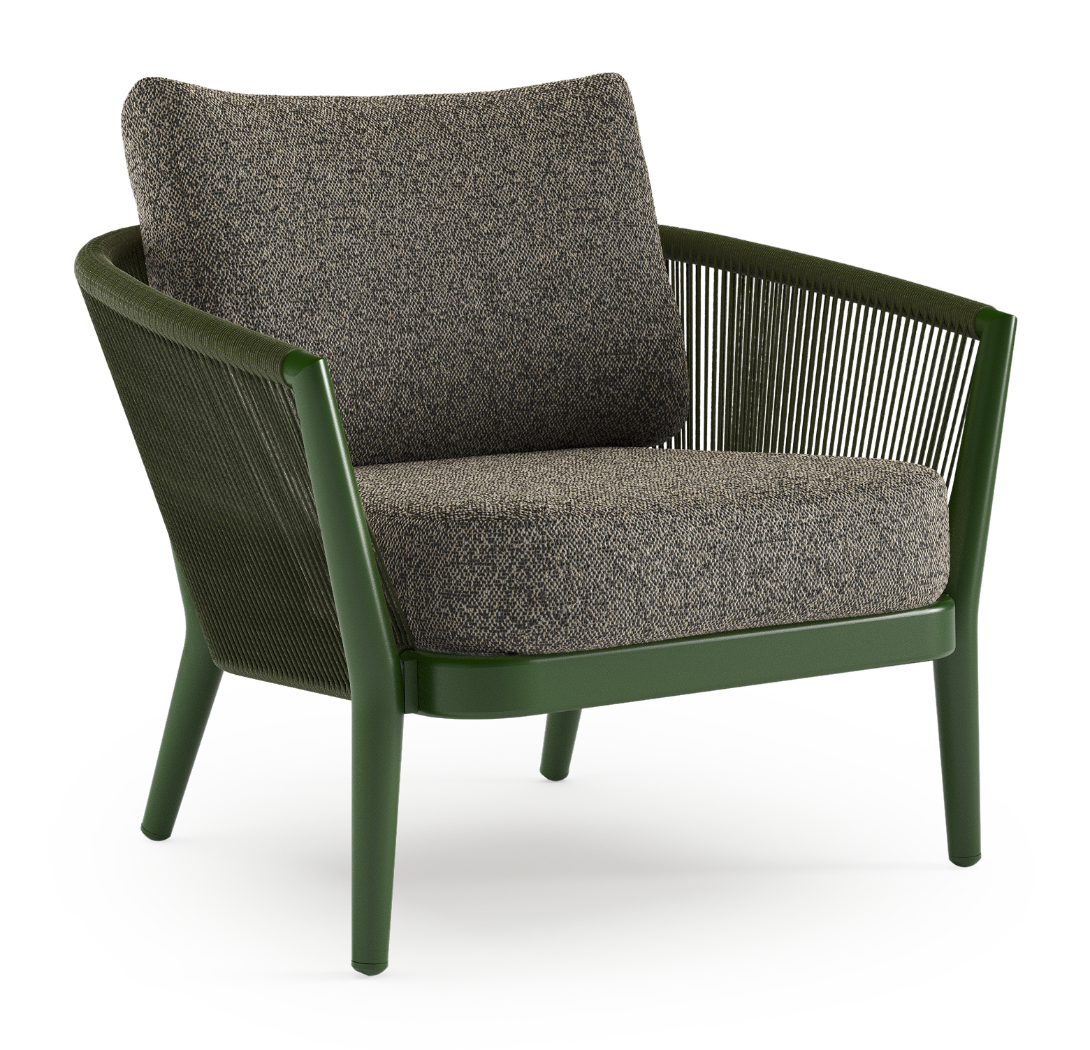 Orso loungestoel in groen aluminium en groen verticaal geweven ronde rope met Marbella Tunder all weather cosytica kussen | Exterioo tuinmeubelen