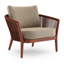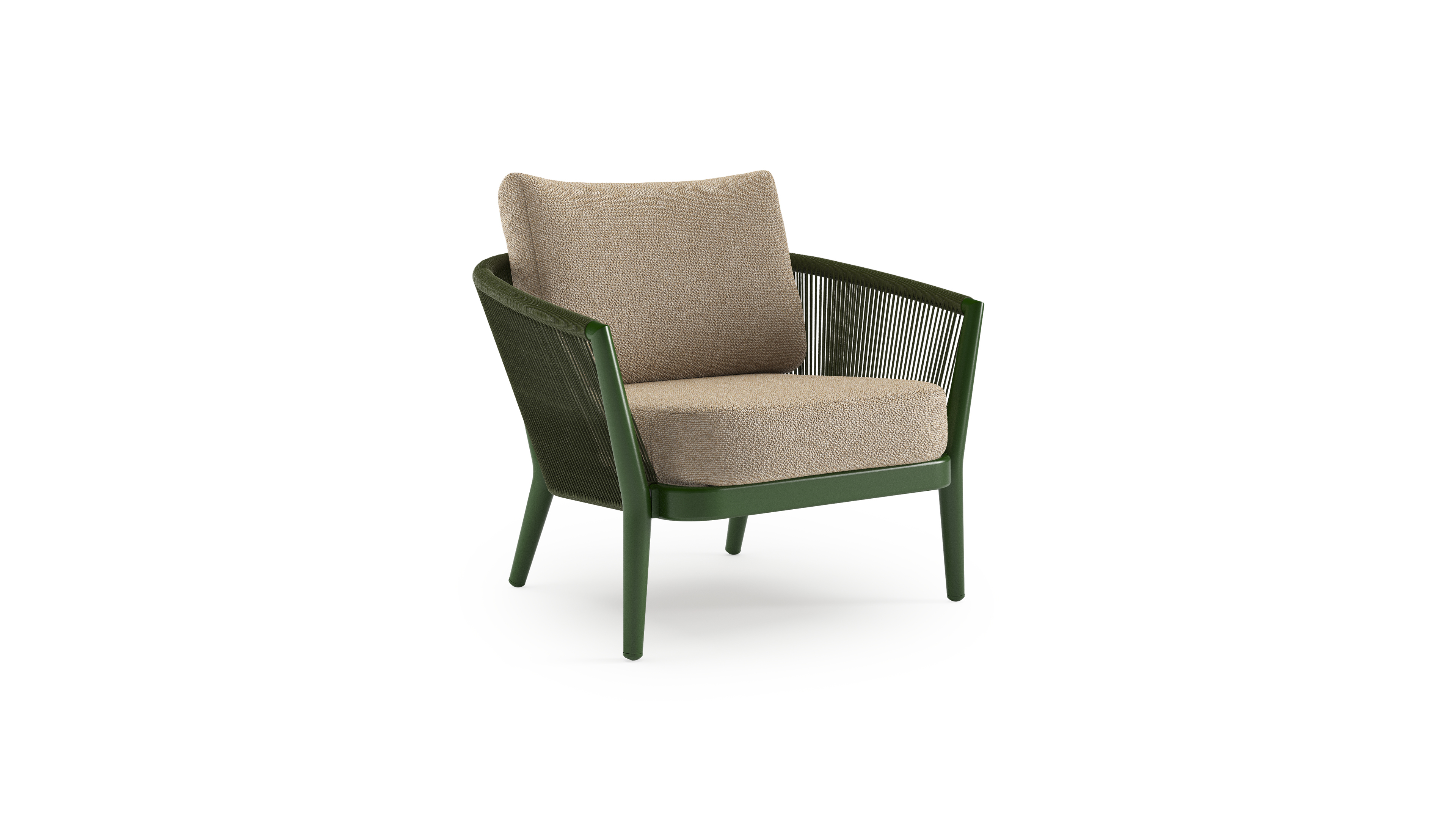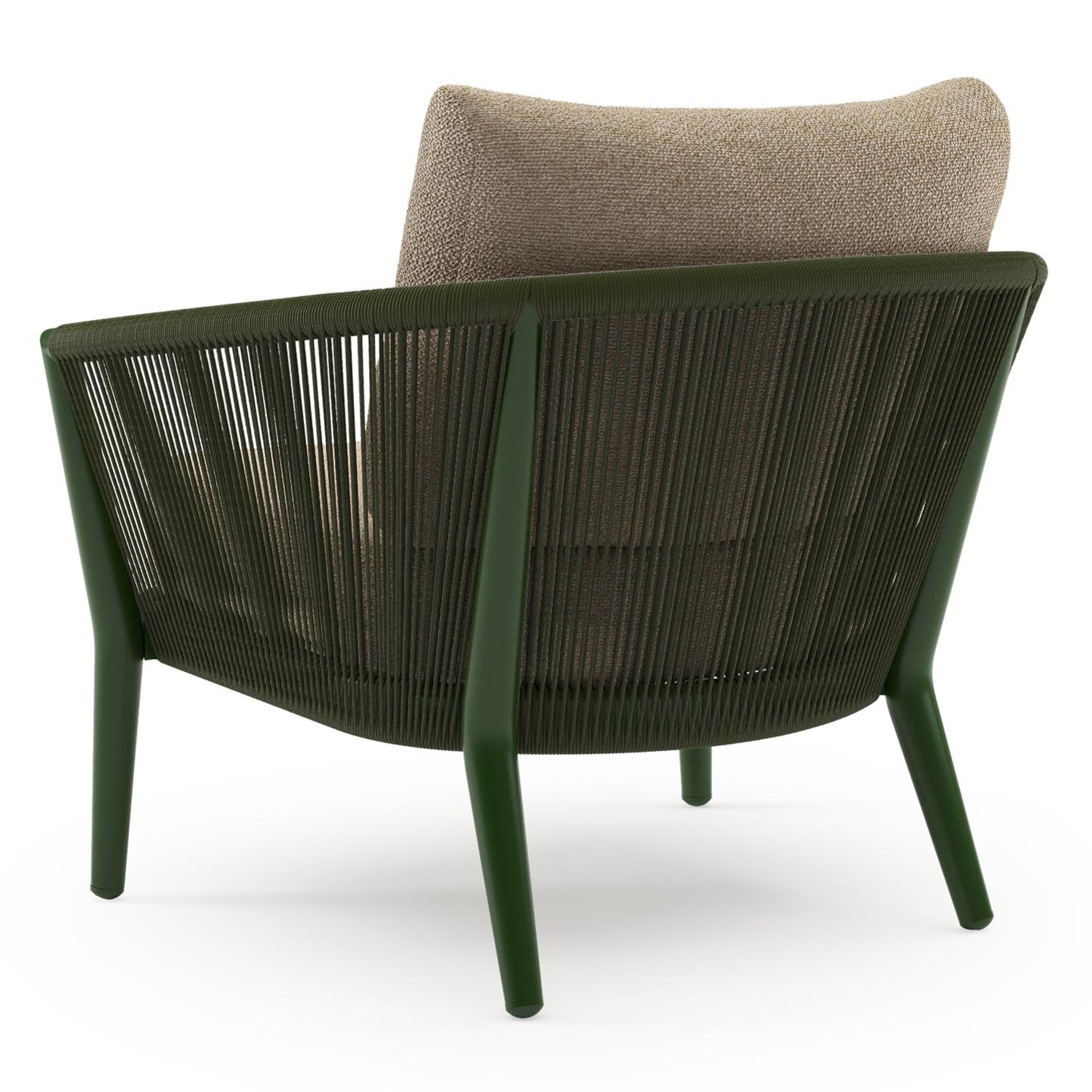 Orso loungestoel in groen aluminium en groen verticaal geweven ronde rope met Madagascar Oak all weather cosytica kussen | Exterioo tuinmeubelen