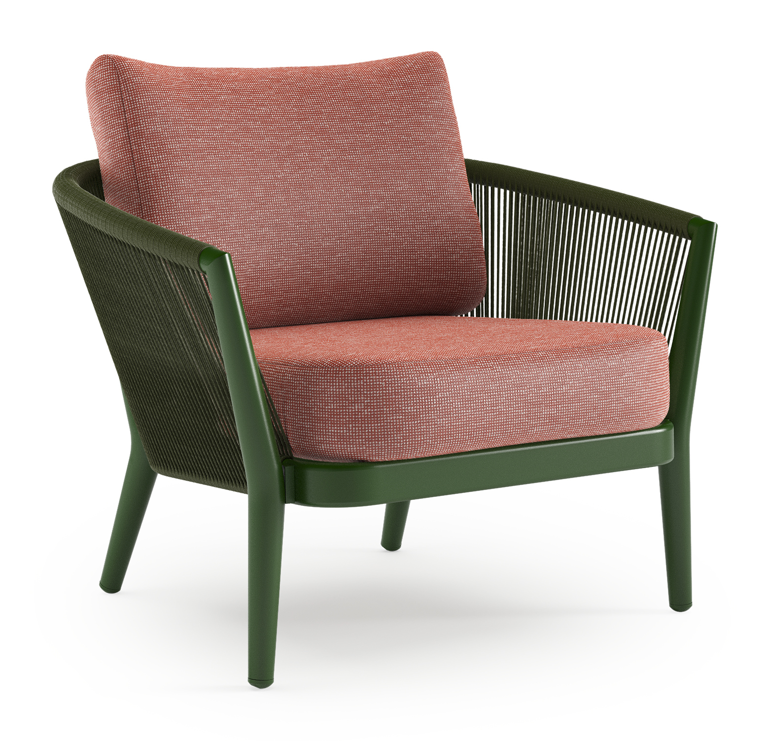 Orso loungestoel in groen aluminium en groen verticaal geweven ronde rope met Slow Alezan all weather sunbrella® luxe kussen | Exterioo tuinmeubelen
