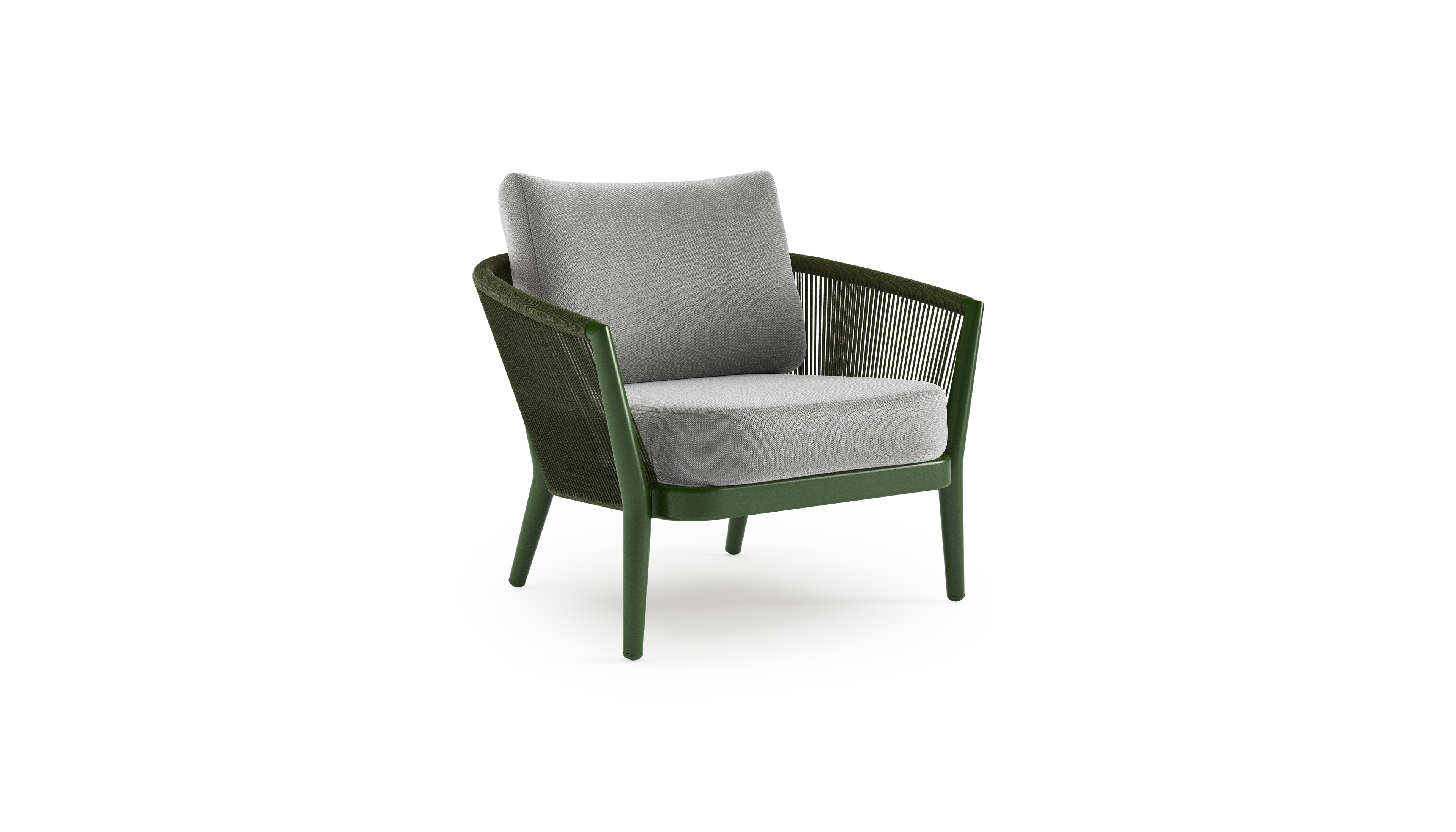 Orso loungestoel in groen aluminium en groen verticaal geweven ronde rope met Savane Grey all weather sunbrella® luxe kussen | Exterioo tuinmeubelen