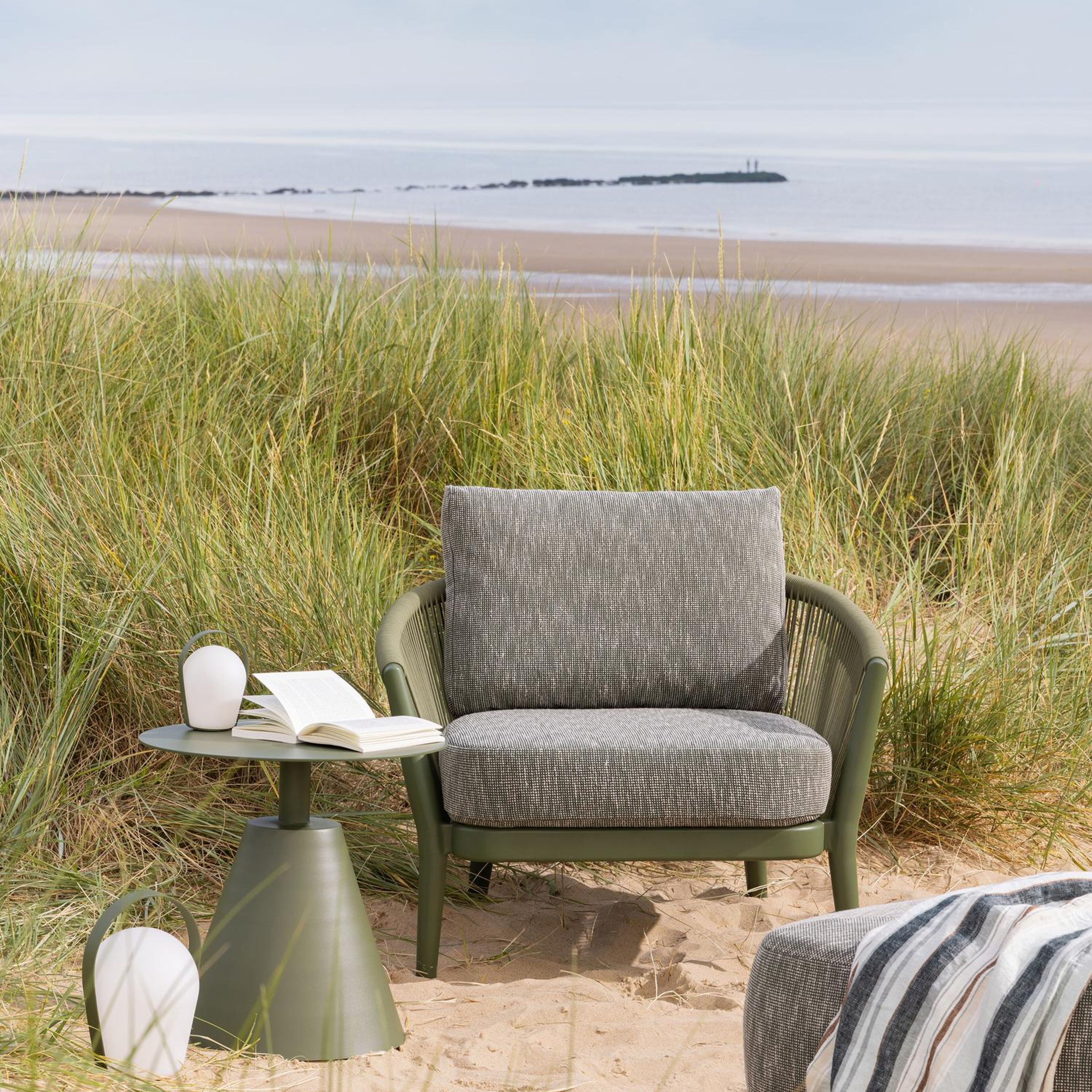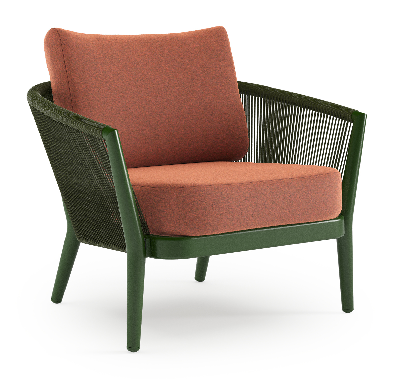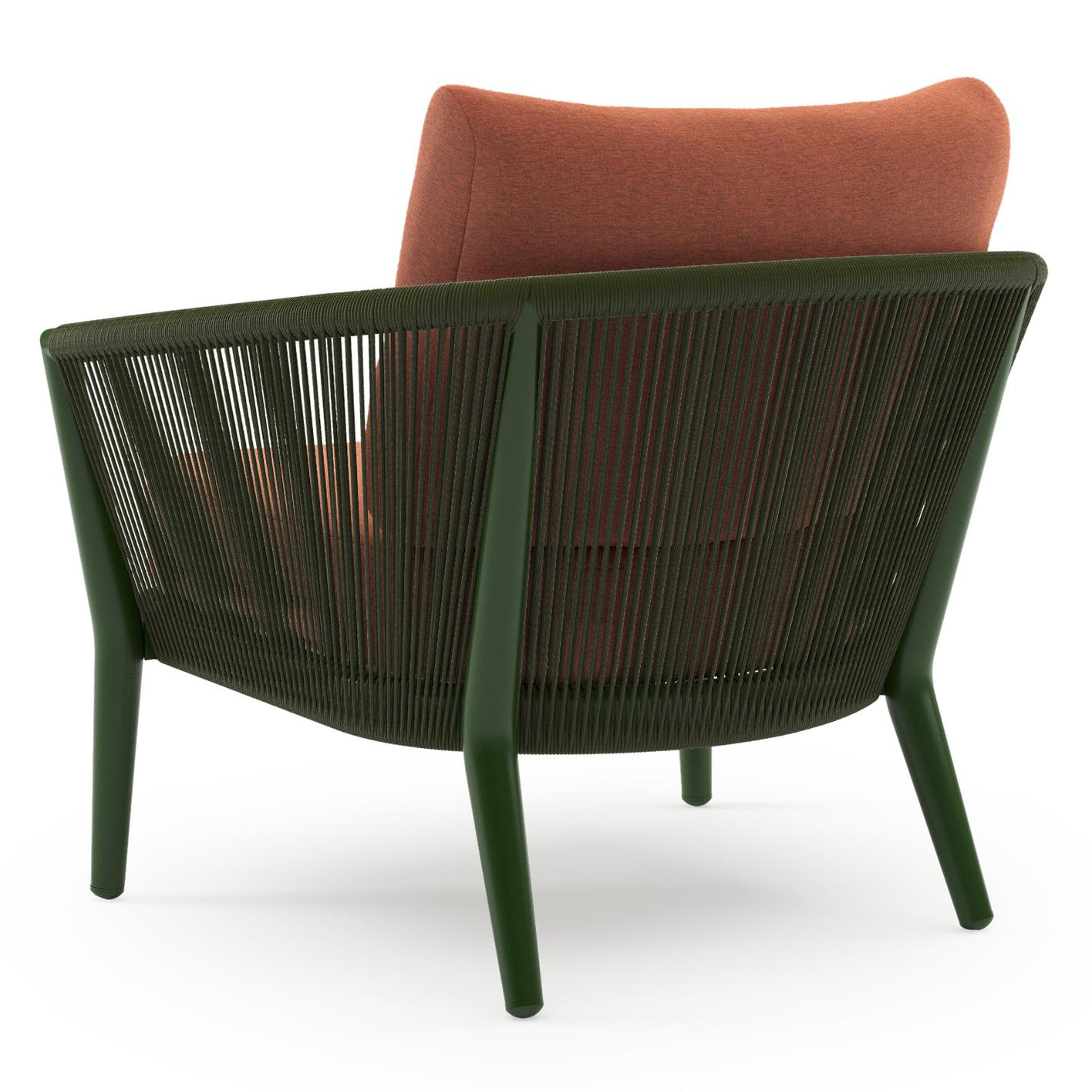 Orso loungestoel in groen aluminium en groen verticaal geweven ronde rope met Heritage Rust all weather sunbrella® luxe kussen | Exterioo tuinmeubelen