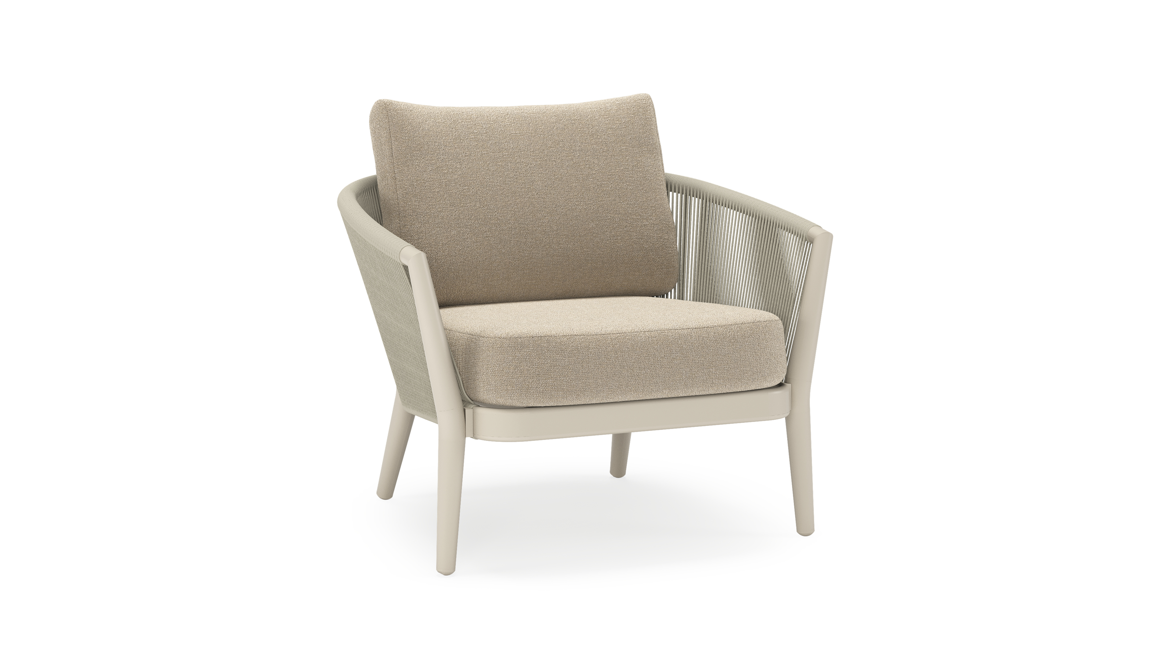 Orso loungestoel in beige aluminium en beige verticaal geweven ronde rope met Marbella Sand all weather cosytica kussen | Exterioo tuinmeubelen