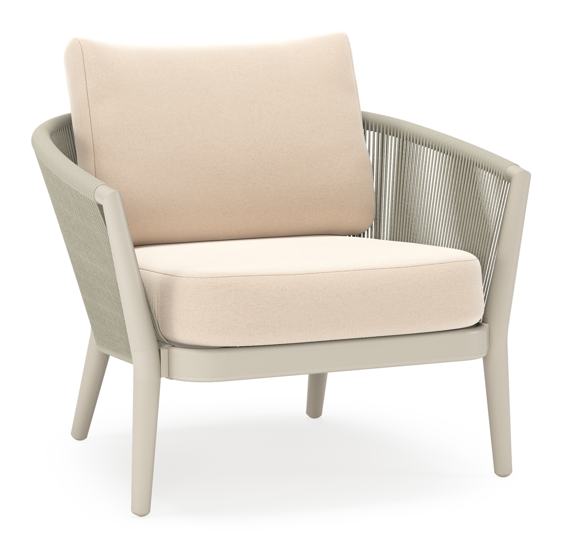 Orso loungestoel in beige aluminium en beige verticaal geweven ronde rope met Natte Linen Chalk all weather sunbrella® luxe kussen | Exterioo tuinmeubelen