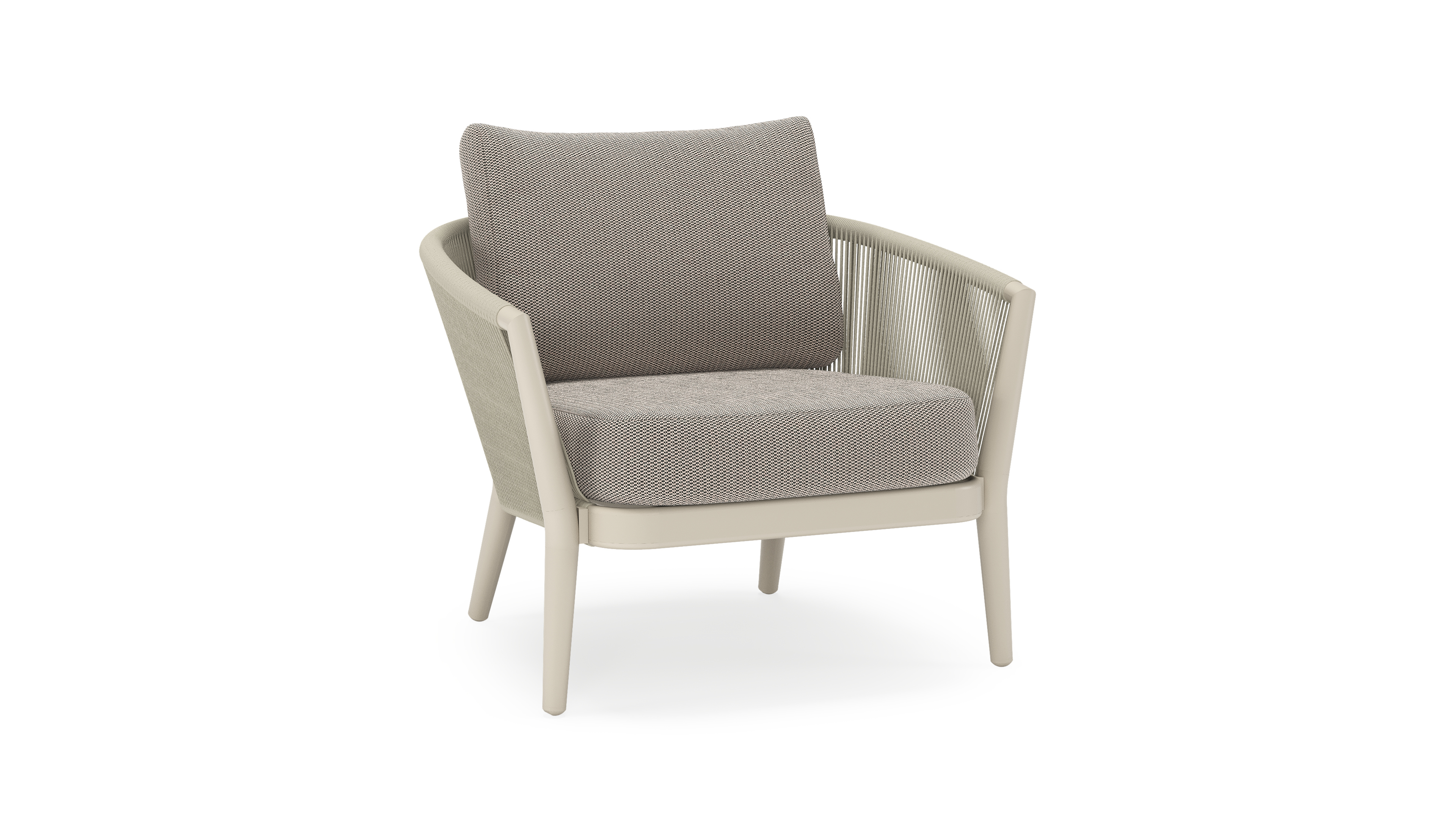 Orso loungestoel in beige aluminium en beige verticaal geweven ronde rope met Lopi Pepper all weather sunbrella® luxe kussen | Exterioo tuinmeubelen
