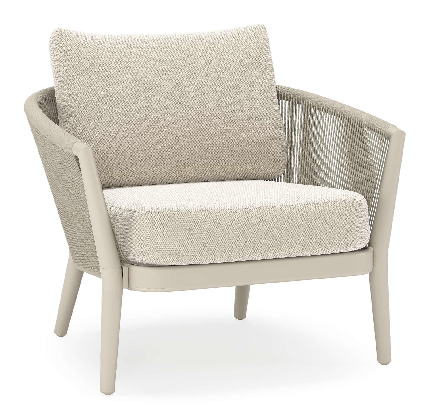 Orso loungestoel in beige aluminium en beige verticaal geweven ronde rope met Lopi Marble all weather sunbrella® luxe kussen | Exterioo tuinmeubelen
