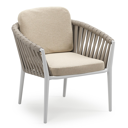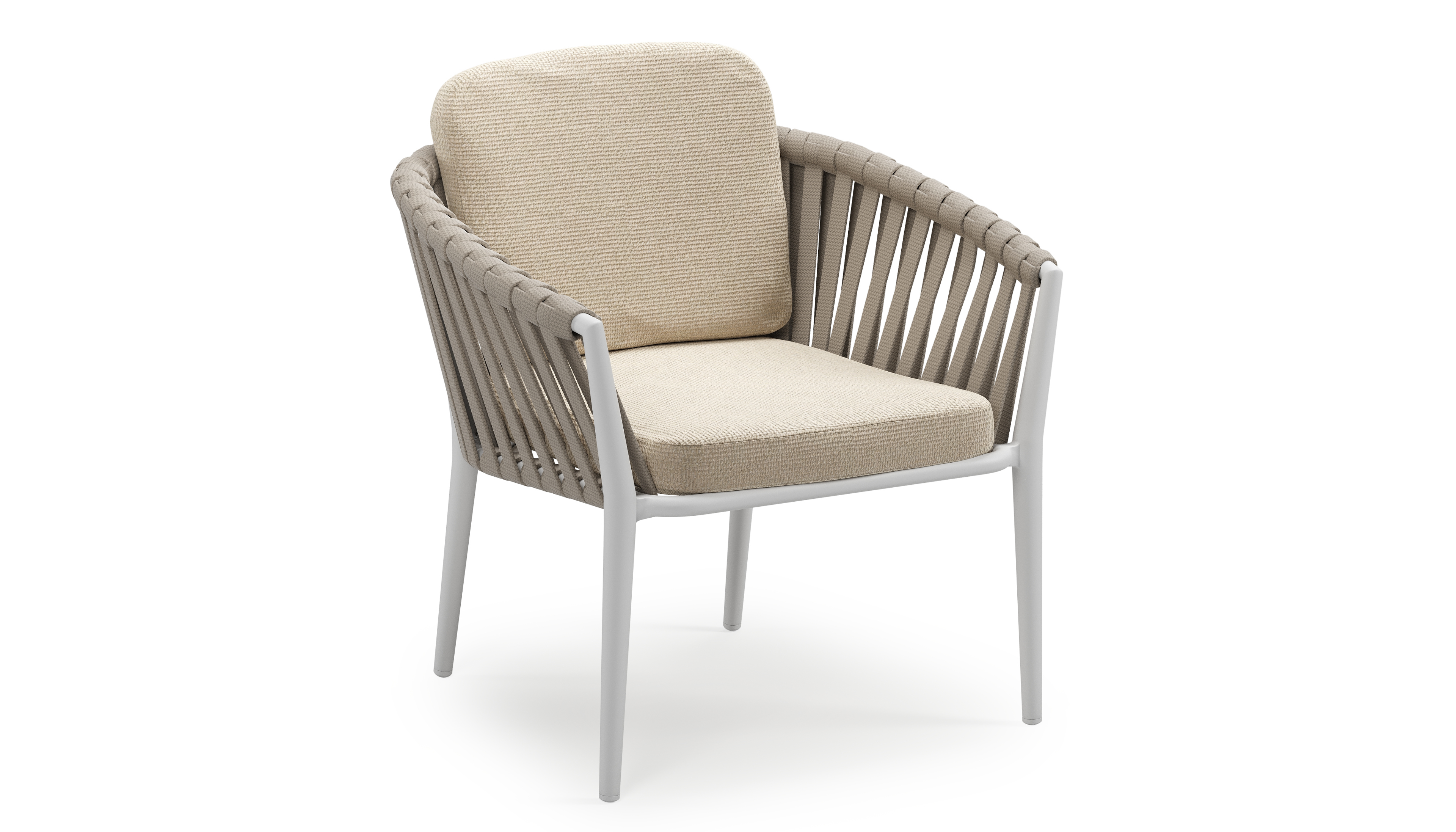 Orso low dining tuinstoel in wit aluminium en beige verticaal geweven luxe vlakke brede rope met stoelkussen in All Weather Cosytica Althea Chalk | Exterioo tuinmeubelen