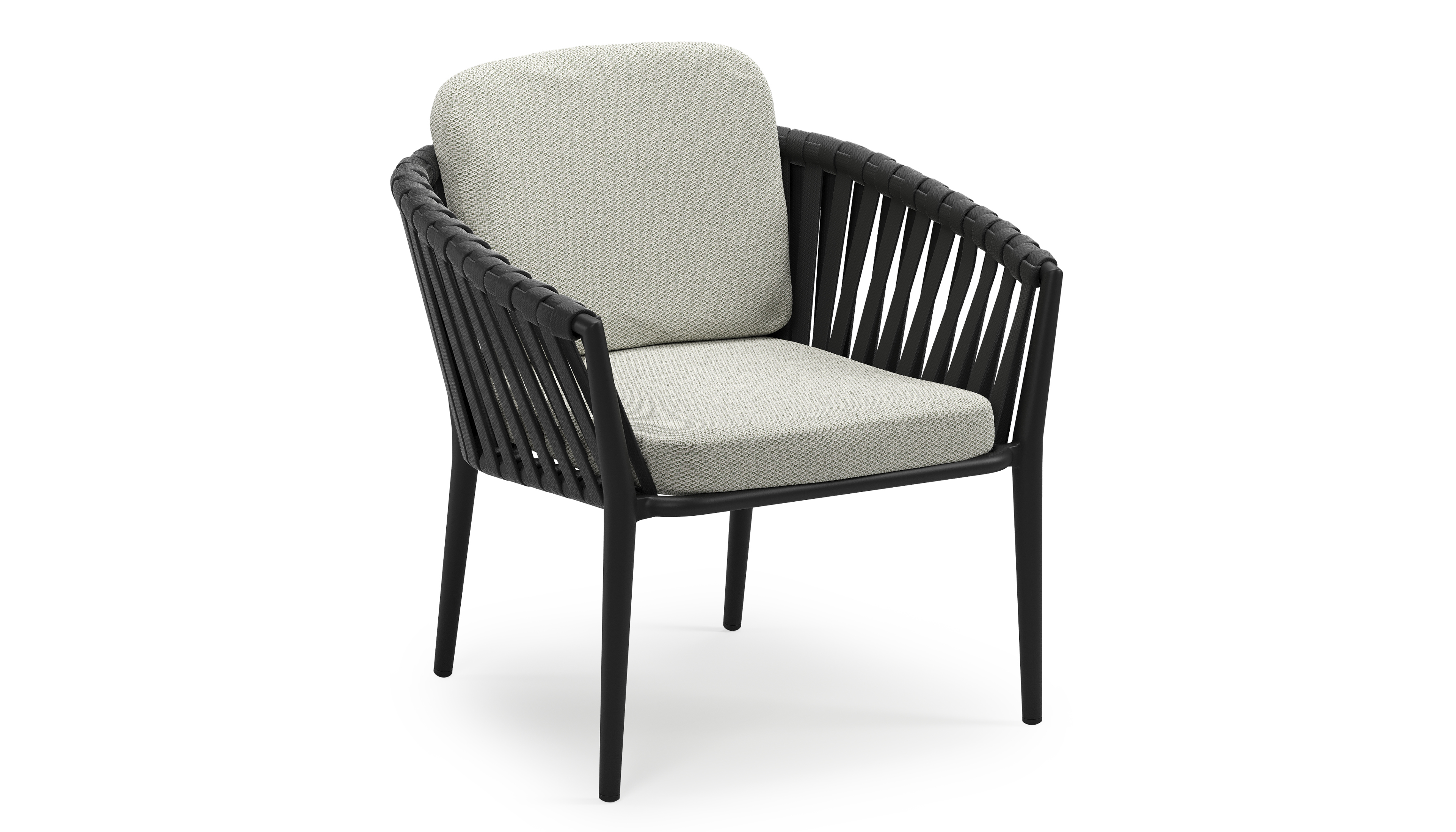Orso low dining tuinstoel in zwart aluminium en zwart verticaal geweven luxe vlakke brede rope met stoelkussen in All Weather Sunbrella® Luxe Lopi Bud | Exterioo tuinmeubelen