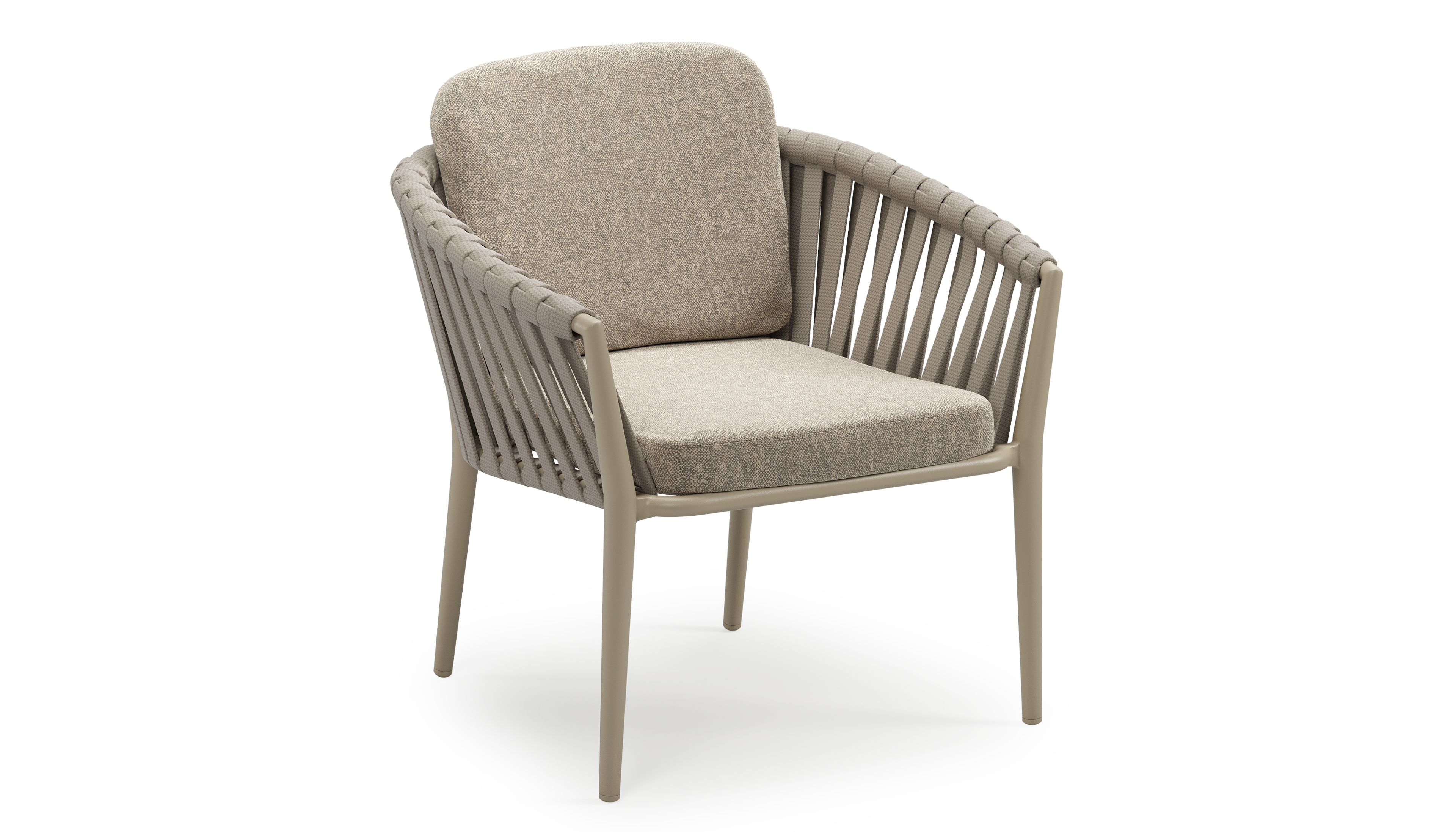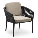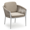 Orso low dining tuinstoel in beige aluminium en beige verticaal geweven luxe vlakke brede rope met stoelkussen in All Weather Sunbrella® Luxe Chartres Pewter | Exterioo tuinmeubelen