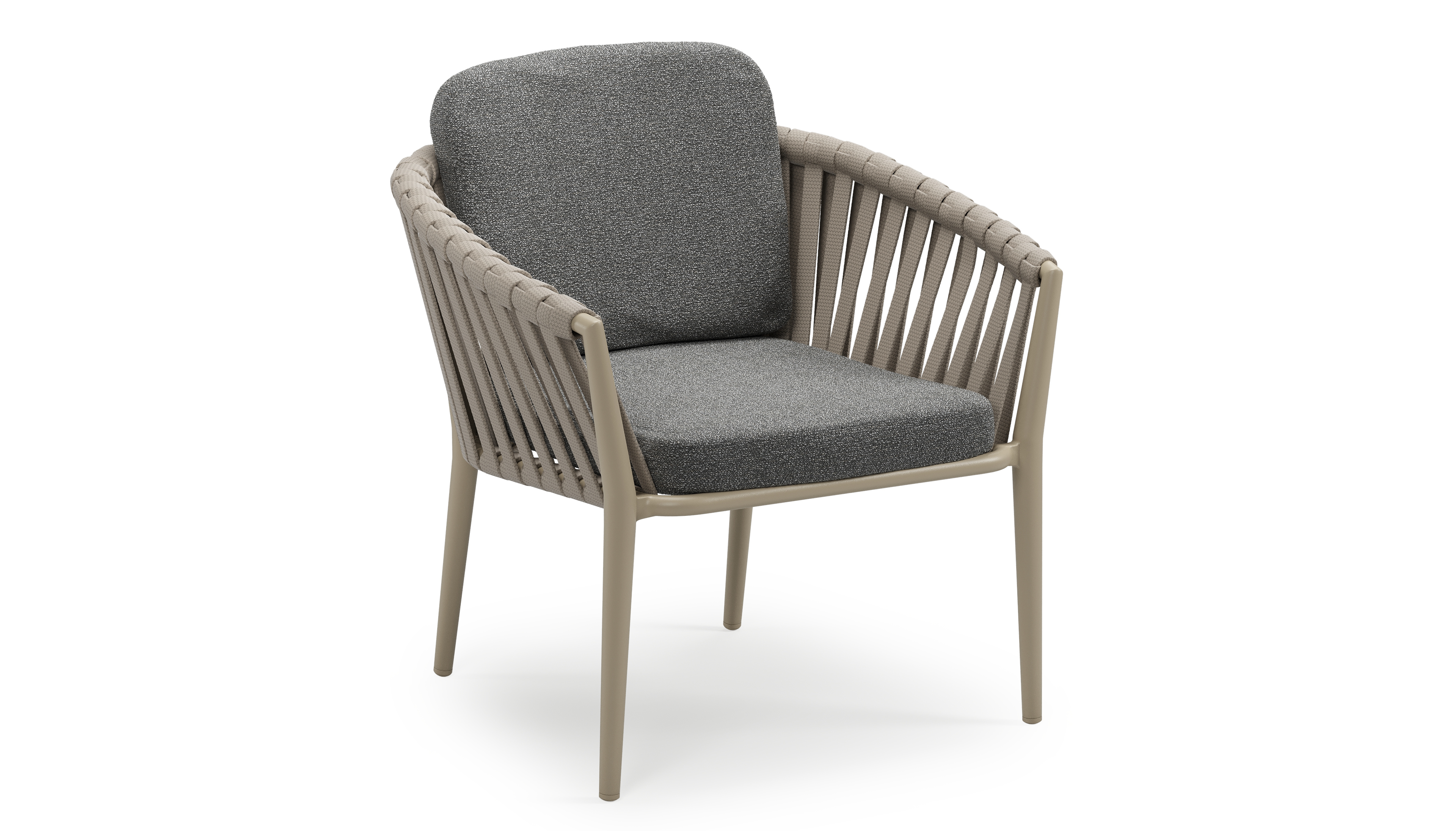 Orso low dining tuinstoel in beige aluminium en beige verticaal geweven luxe vlakke brede rope met stoelkussen in All Weather Cosytica Catania Black | Exterioo tuinmeubelen