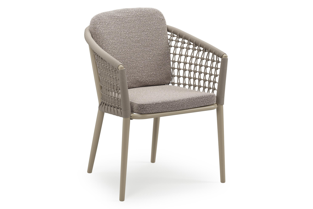 Orso stapelbare tuinstoel in beige aluminium en beige visnet geweven ronde rope met stoelkussen in All Weather Sunbrella® Luxe Wander Granite | Exterioo