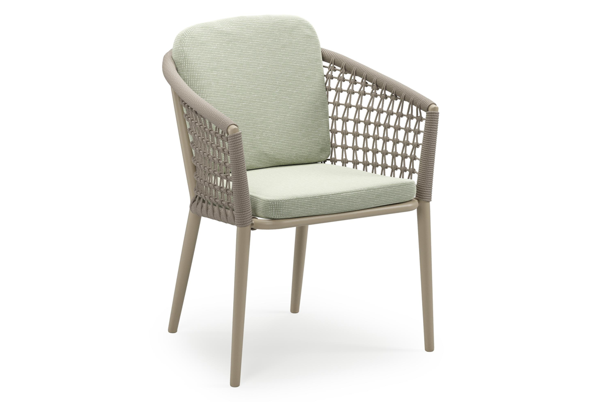 Orso stapelbare tuinstoel in beige aluminium en beige visnet geweven ronde rope met stoelkussen in All Weather Sunbrella® Luxe Slow Spirea | Exterioo