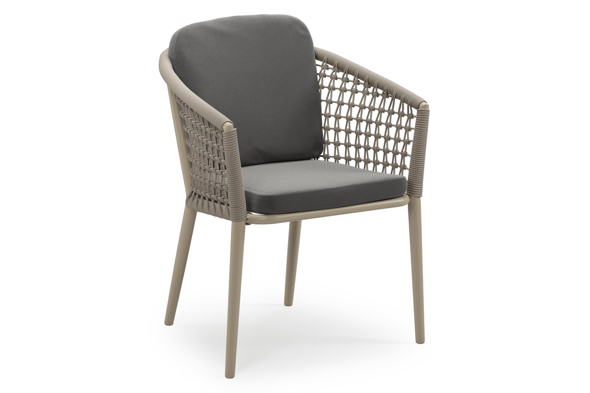 Orso stapelbare tuinstoel in beige aluminium en beige visnet geweven ronde rope met stoelkussen in All Weather Sunbrella® Luxe Natte Charcoal Chine | Exterioo