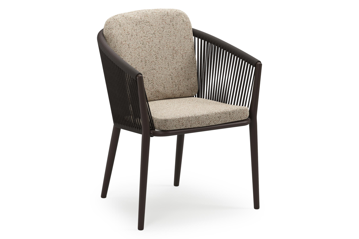 Orso stapelbare tuinstoel in donkerbruin aluminium en donkerbruin verticaal geweven ronde rope met stoelkussen in All Weather Cosytica Bora Jungle | Exterioo
