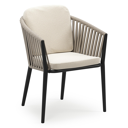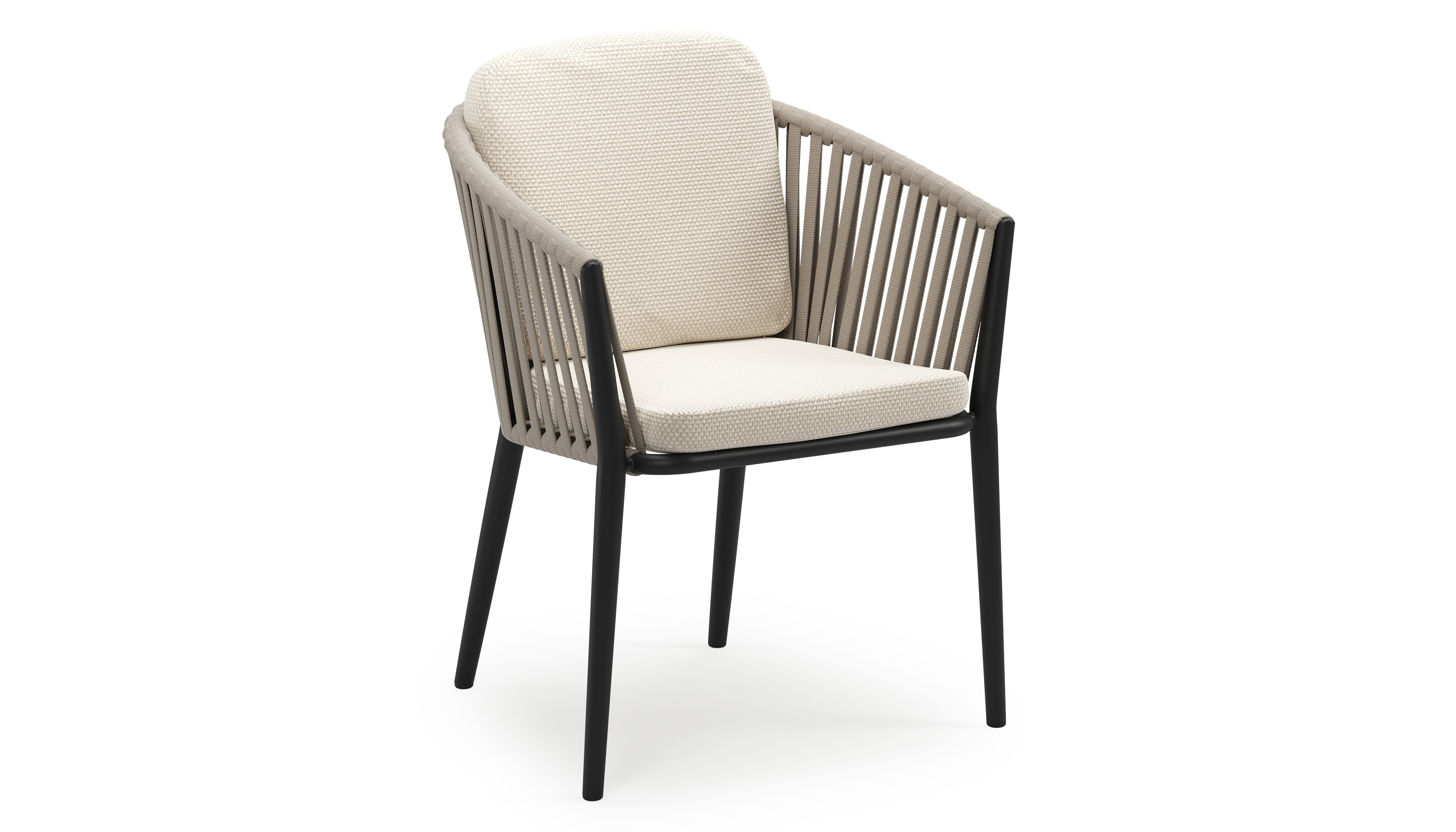 Orso stapelbare tuinstoel in zwart aluminium en beige verticaal geweven luxe vlakke brede rope met stoelkussen in All Weather Cosytica Althea Off White | Exterioo tuinmeubelen