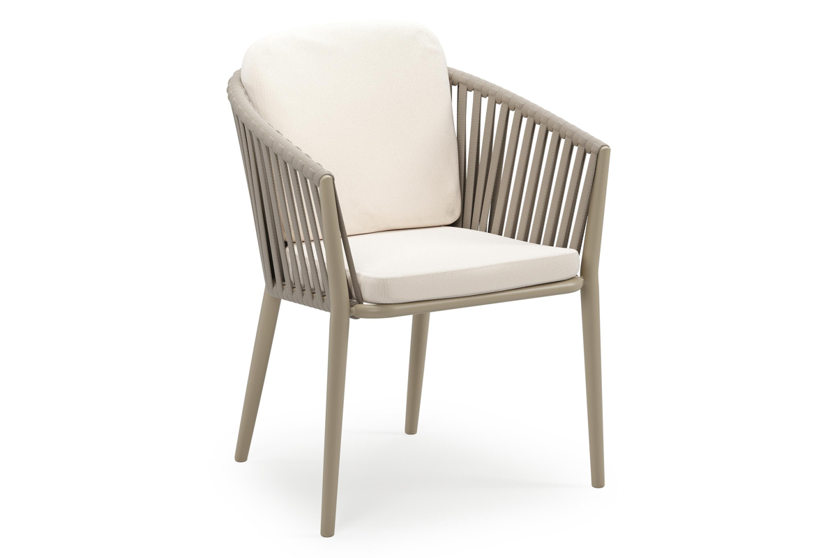 Orso stapelbare tuinstoel in beige aluminium en beige verticaal geweven luxe vlakke brede rope met stoelkussen in All Weather Sunbrella® Luxe Lopi Snow | Exterioo