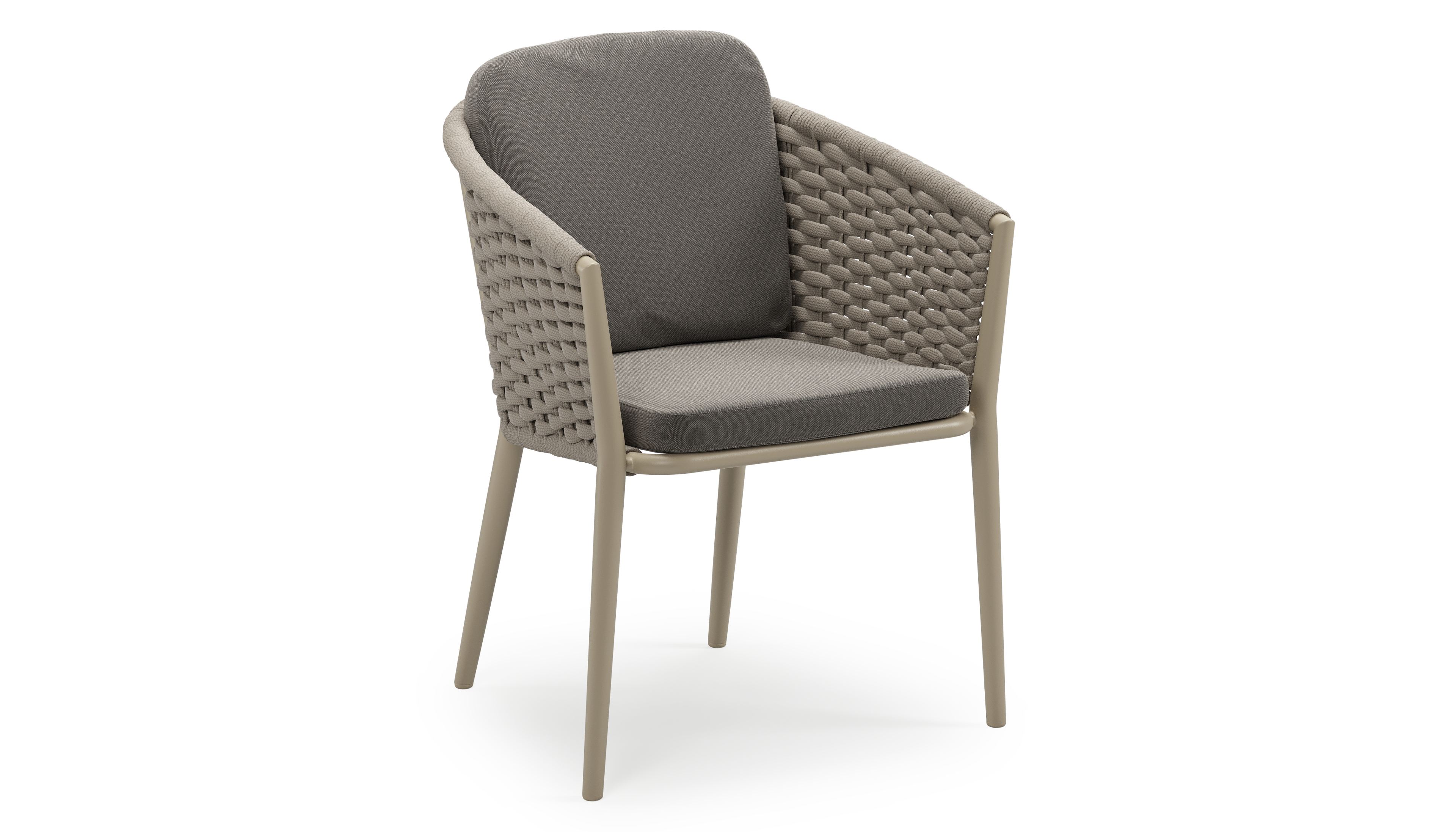 Orso stapelbare tuinstoel in beige aluminium en beige horizontaal geweven ronde rope met stoelkussen in All Weather Sunbrella® Luxe Natte Dark Taupe | Exterioo tuinmeubelen