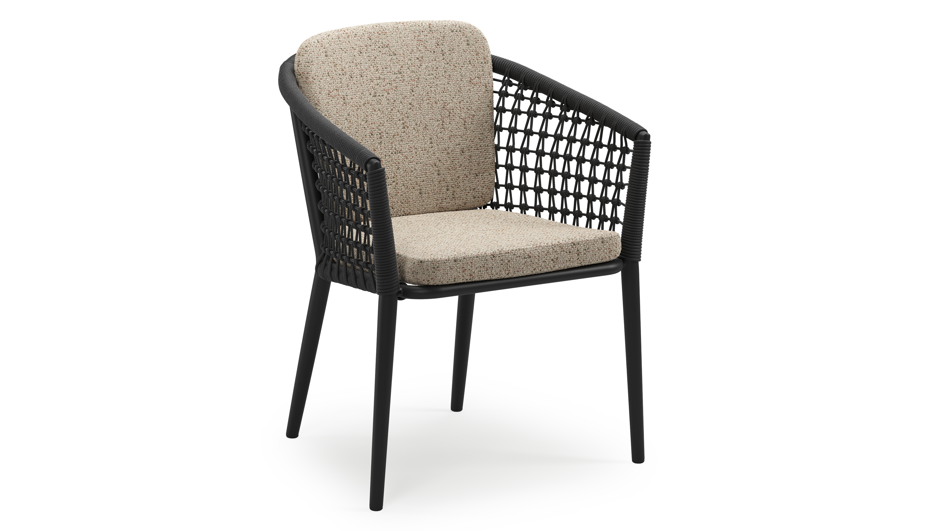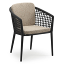 Orso stapelbare tuinstoel in zwart aluminium en zwart visnet geweven ronde rope met stoelkussen in All Weather Cosytica Bora Jungle | Exterioo tuinmeubelen
