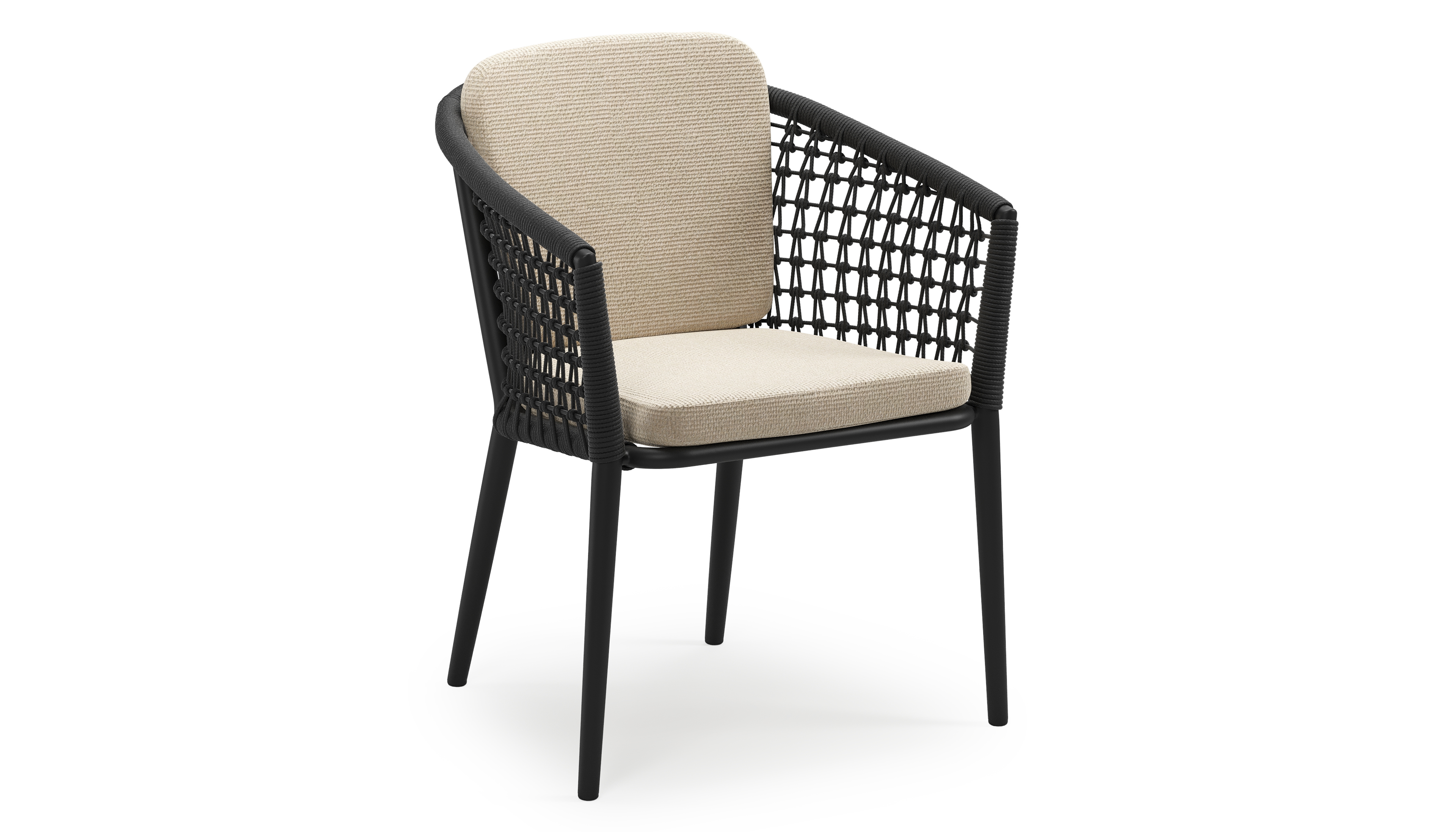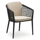 Orso stapelbare tuinstoel in zwart aluminium en zwart visnet geweven ronde rope met stoelkussen in All Weather Cosytica Althea Chalk | Exterioo tuinmeubelen