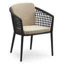 Orso stapelbare tuinstoel in zwart aluminium en zwart visnet geweven ronde rope met stoelkussen in All Weather Cosytica Althea Camel | Exterioo tuinmeubelen