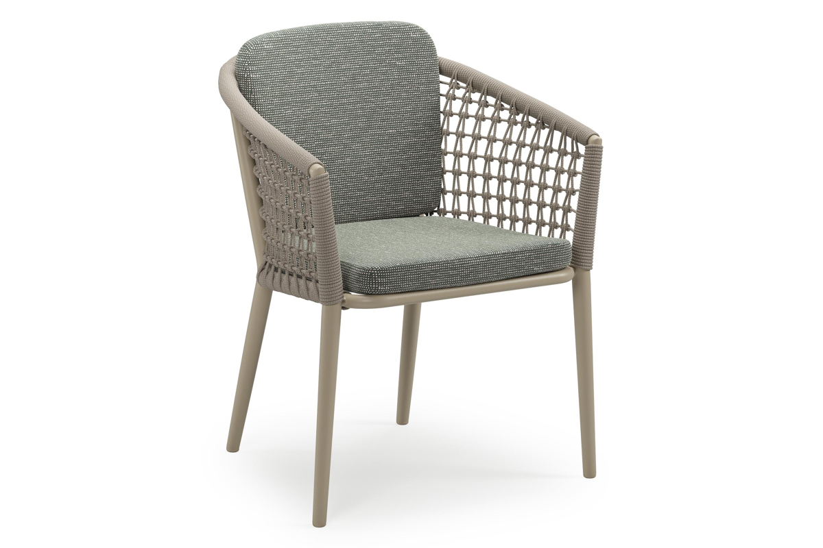 Orso stapelbare tuinstoel in beige aluminium en beige visnet geweven ronde rope met stoelkussen in All Weather Sunbrella® Luxe Slow Fern | Exterioo