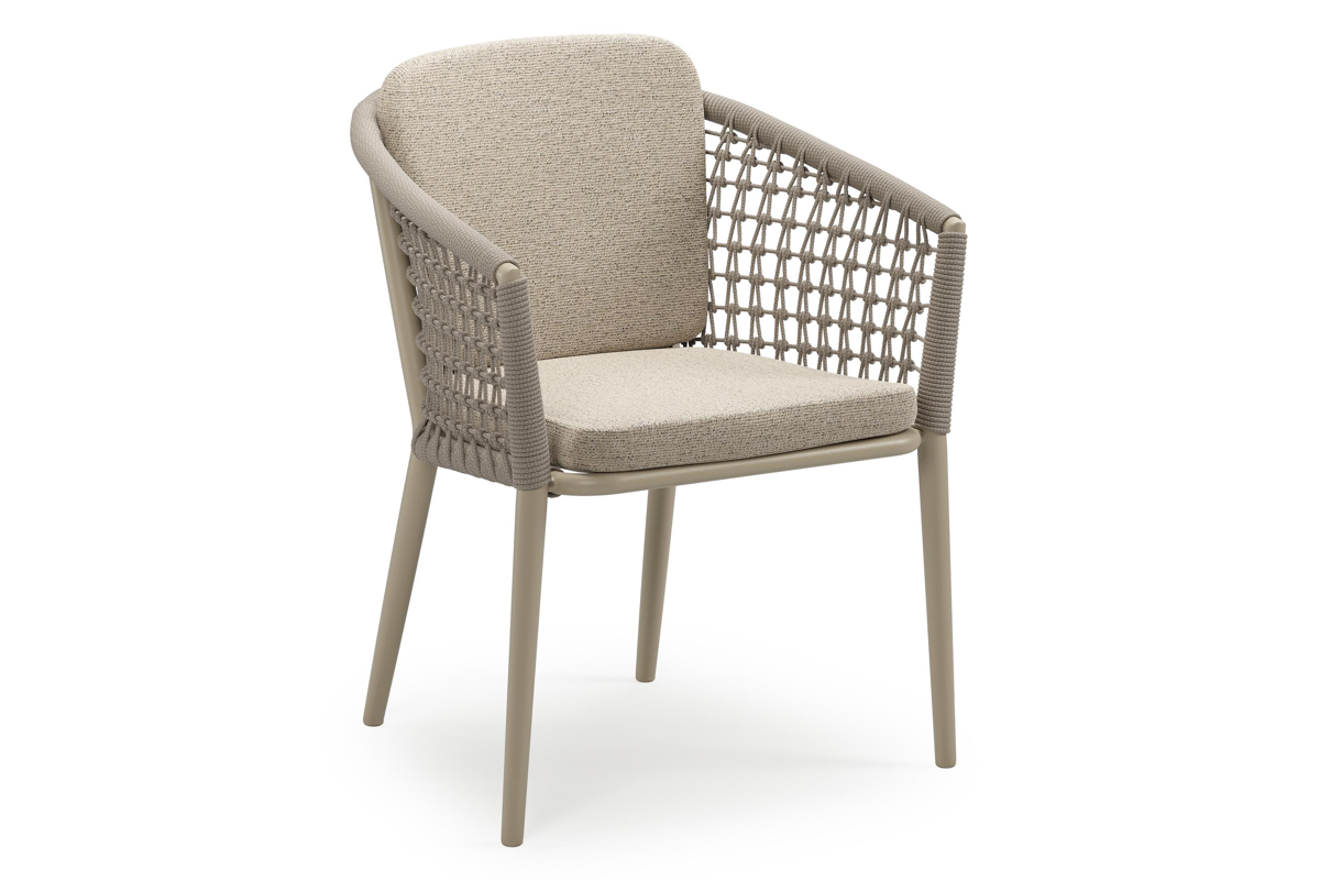 Orso stapelbare tuinstoel in beige aluminium en beige visnet geweven ronde rope met stoelkussen in All Weather Cosytica Marbella Beige | Exterioo