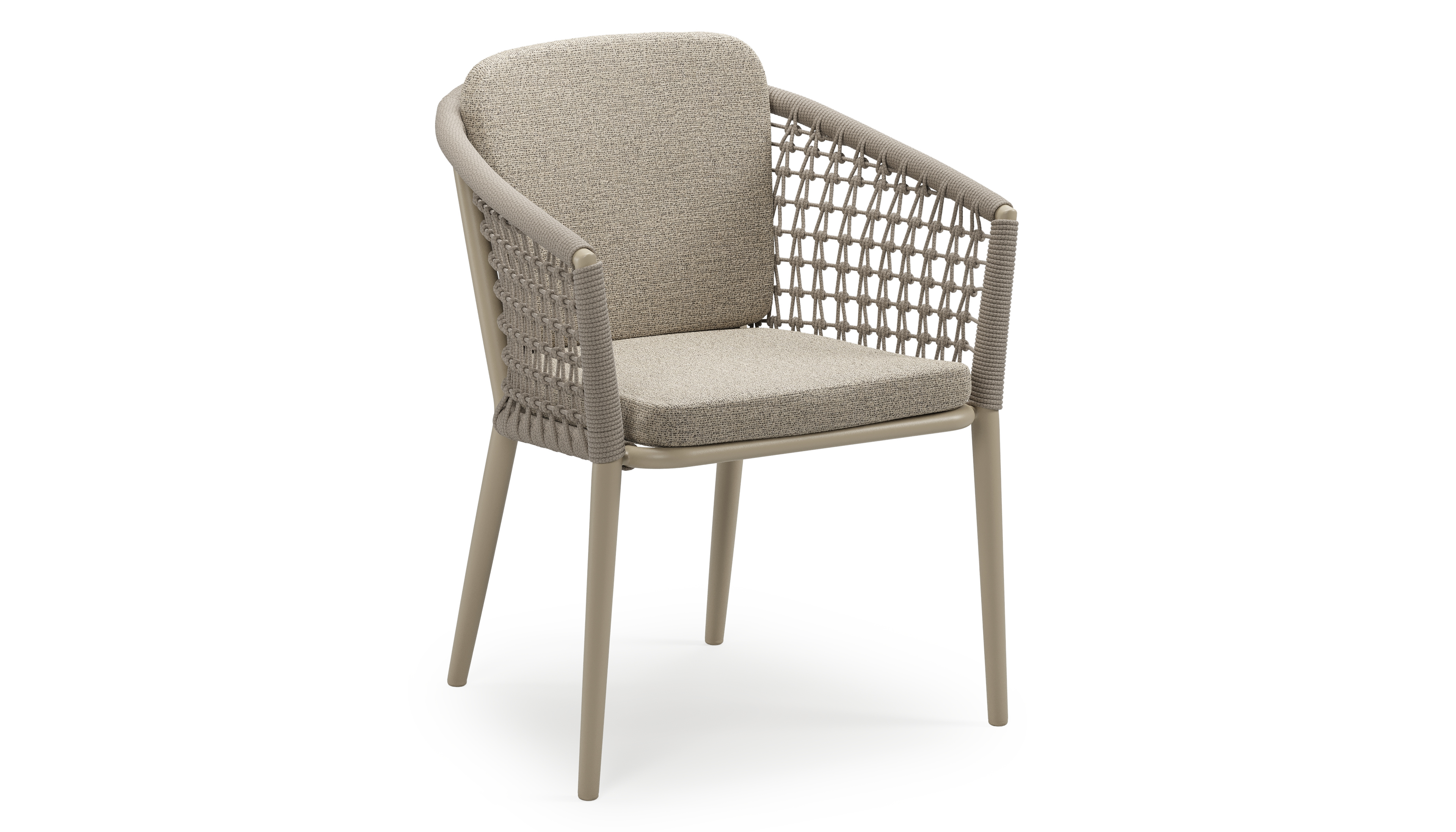 Orso stapelbare tuinstoel in beige aluminium en beige visnet geweven ronde rope met stoelkussen in All Weather Cosytica Catania Beige | Exterioo tuinmeubelen