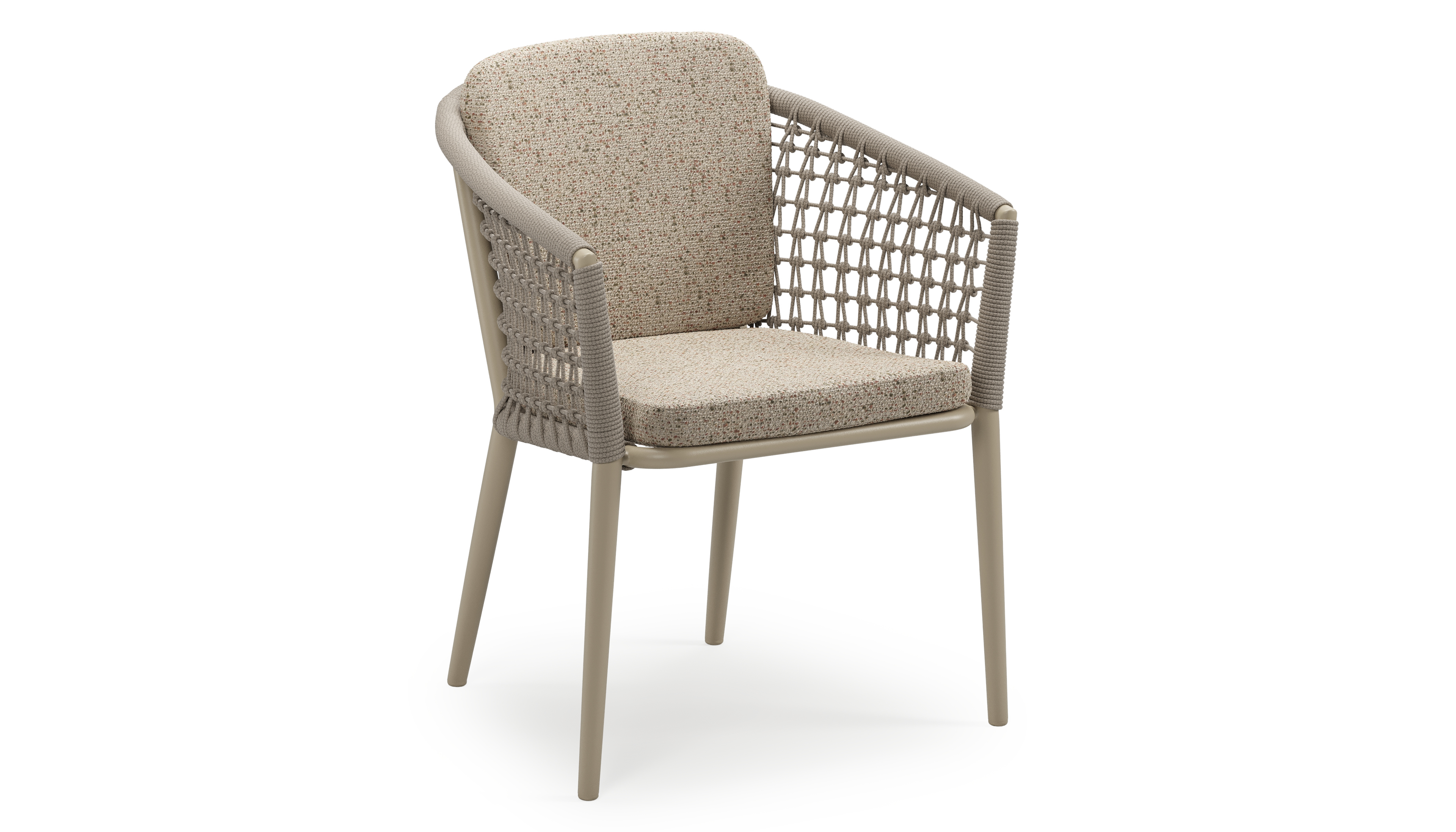 Orso stapelbare tuinstoel in beige aluminium en beige visnet geweven ronde rope met stoelkussen in All Weather Cosytica Bora Jungle | Exterioo tuinmeubelen