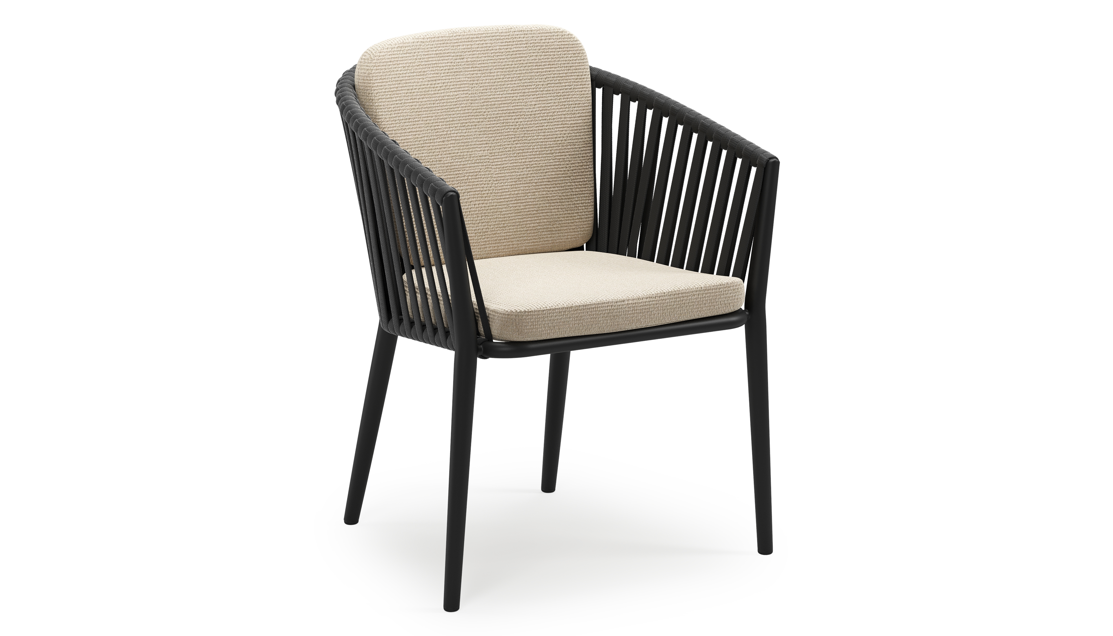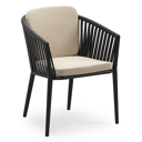 Orso stapelbare tuinstoel in zwart aluminium en zwart verticaal geweven luxe vlakke brede rope met stoelkussen in All Weather Cosytica Althea Chalk | Exterioo tuinmeubelen