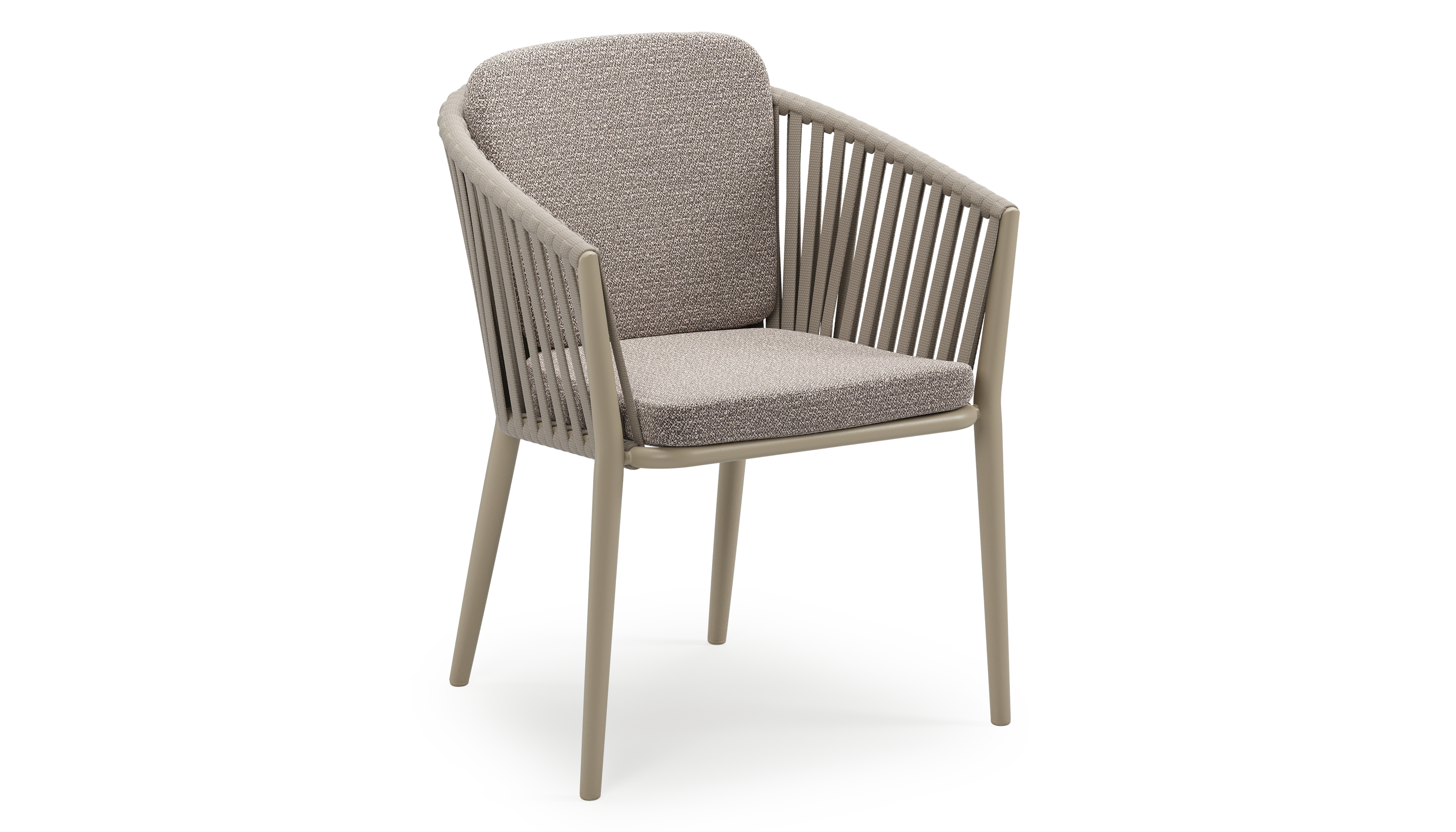 Orso stapelbare tuinstoel in beige aluminium en beige verticaal geweven luxe vlakke brede rope met stoelkussen in All Weather Sunbrella® Luxe Wander Granite | Exterioo tuinmeubelen