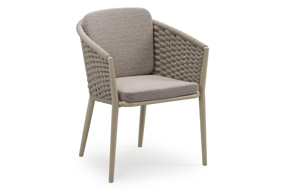Orso stapelbare tuinstoel in beige aluminium en beige horizontaal geweven ronde rope met stoelkussen in All Weather Sunbrella® Luxe Wander Granite | Exterioo